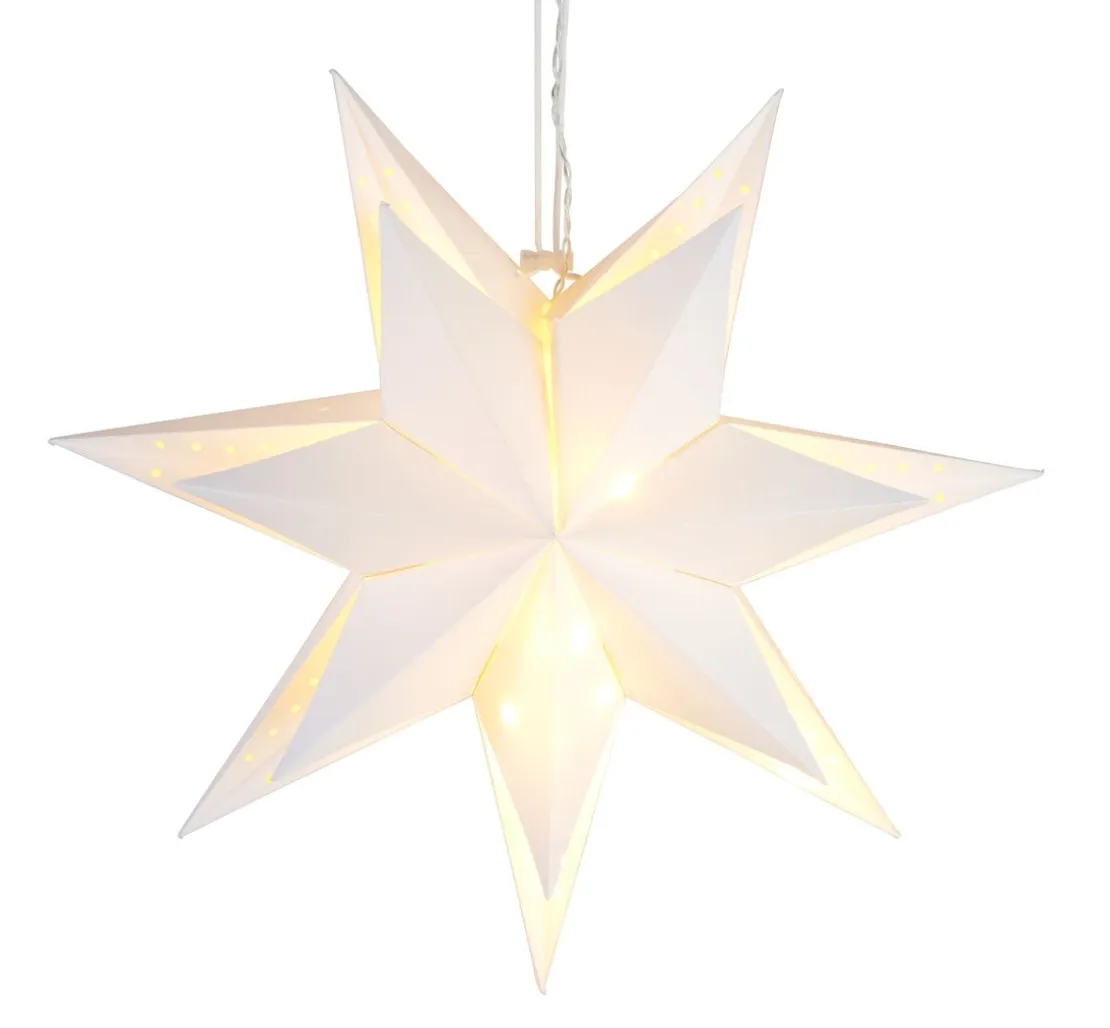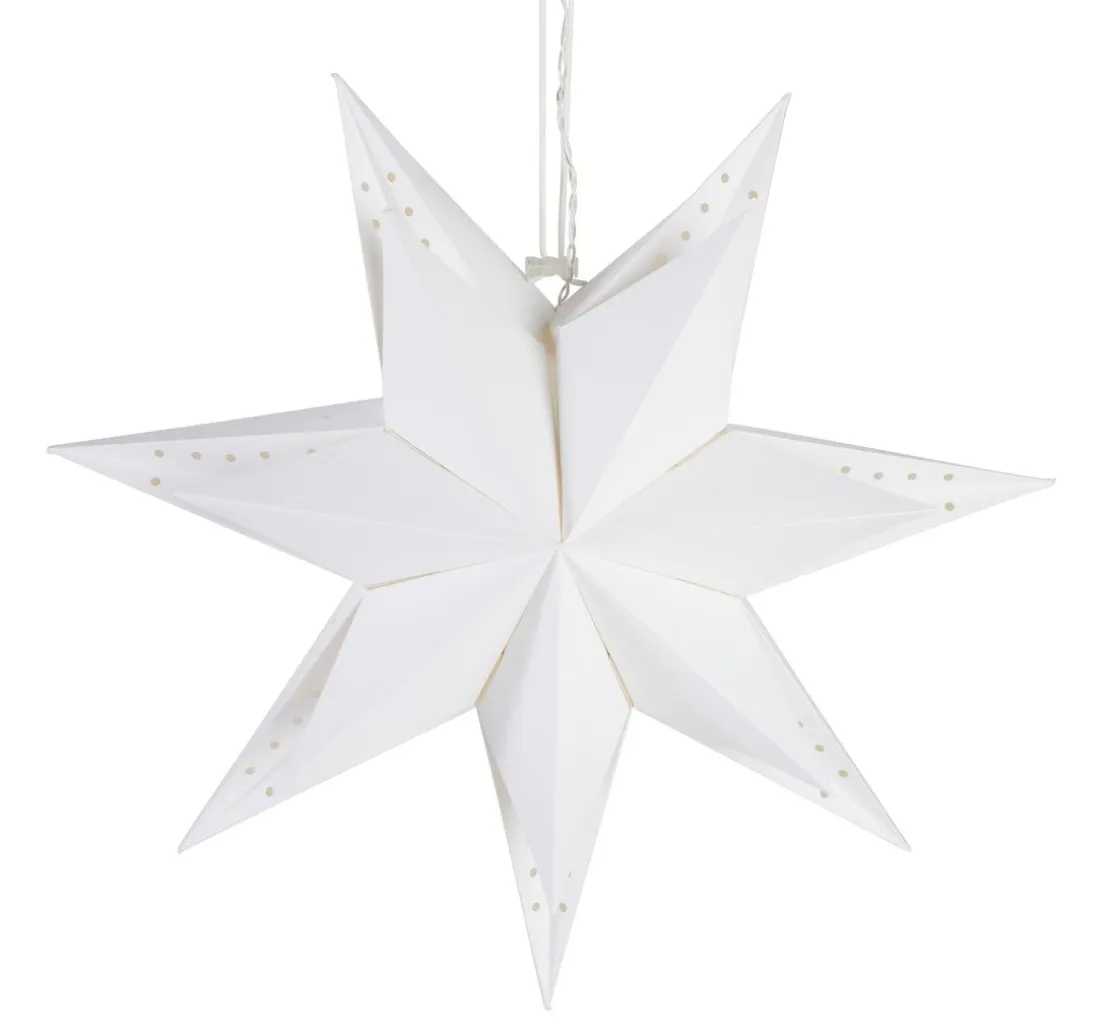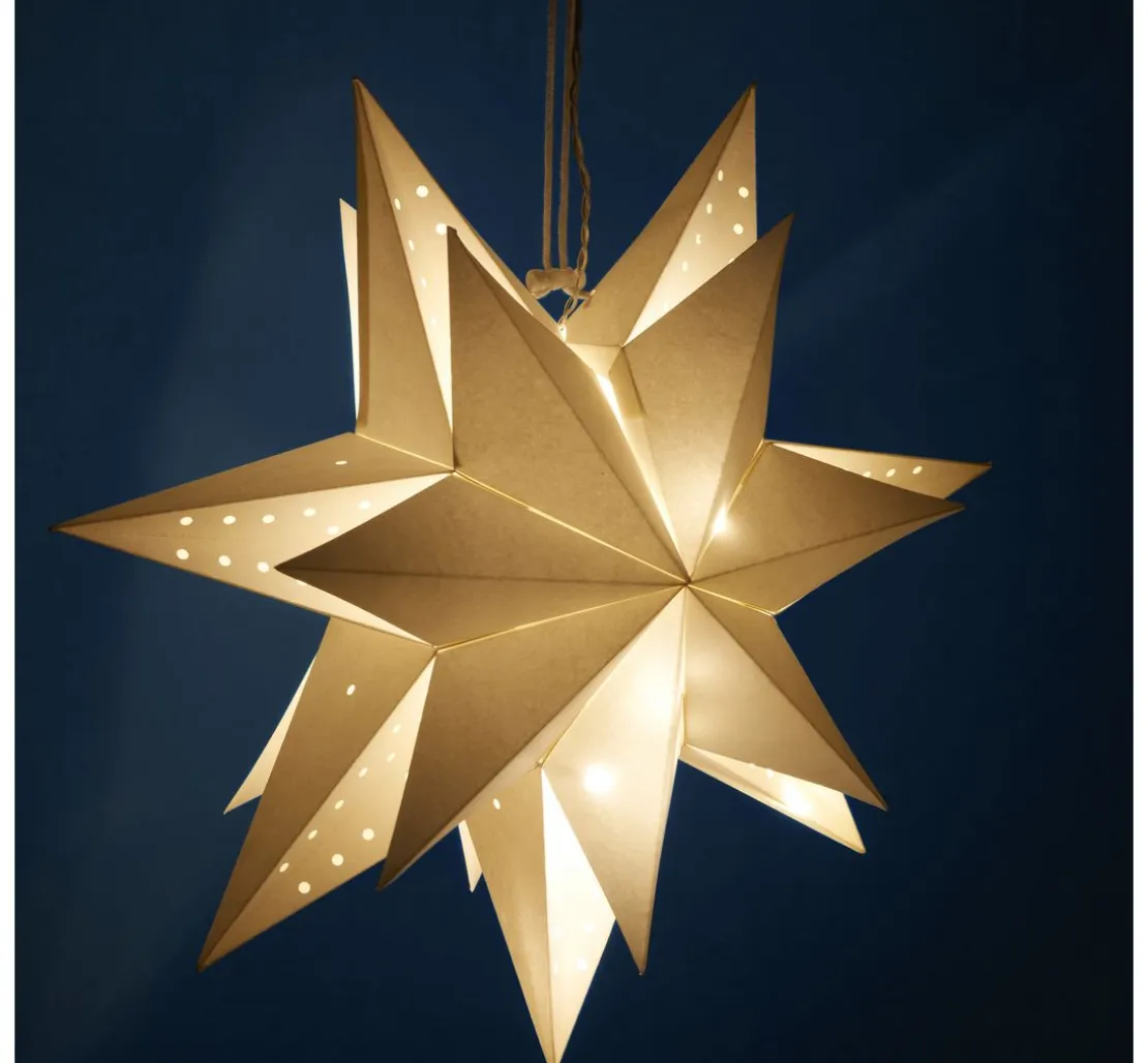 Schicker 3D Papierstern in Weiß mit einem Ø von ca. 45 cm inklusive Beleuchtung. Der 7-zackige Stern lässt sich ganz einfach auffächern und mit der Kordel fixieren. Außerdem ist eine Lichterkette mit 10 LEDs und Timerfunktion enthalten. Betrieben wird diese mit 2 X AA Batterien (nicht im Lieferumfang enthalten). Für den Innenbereich.