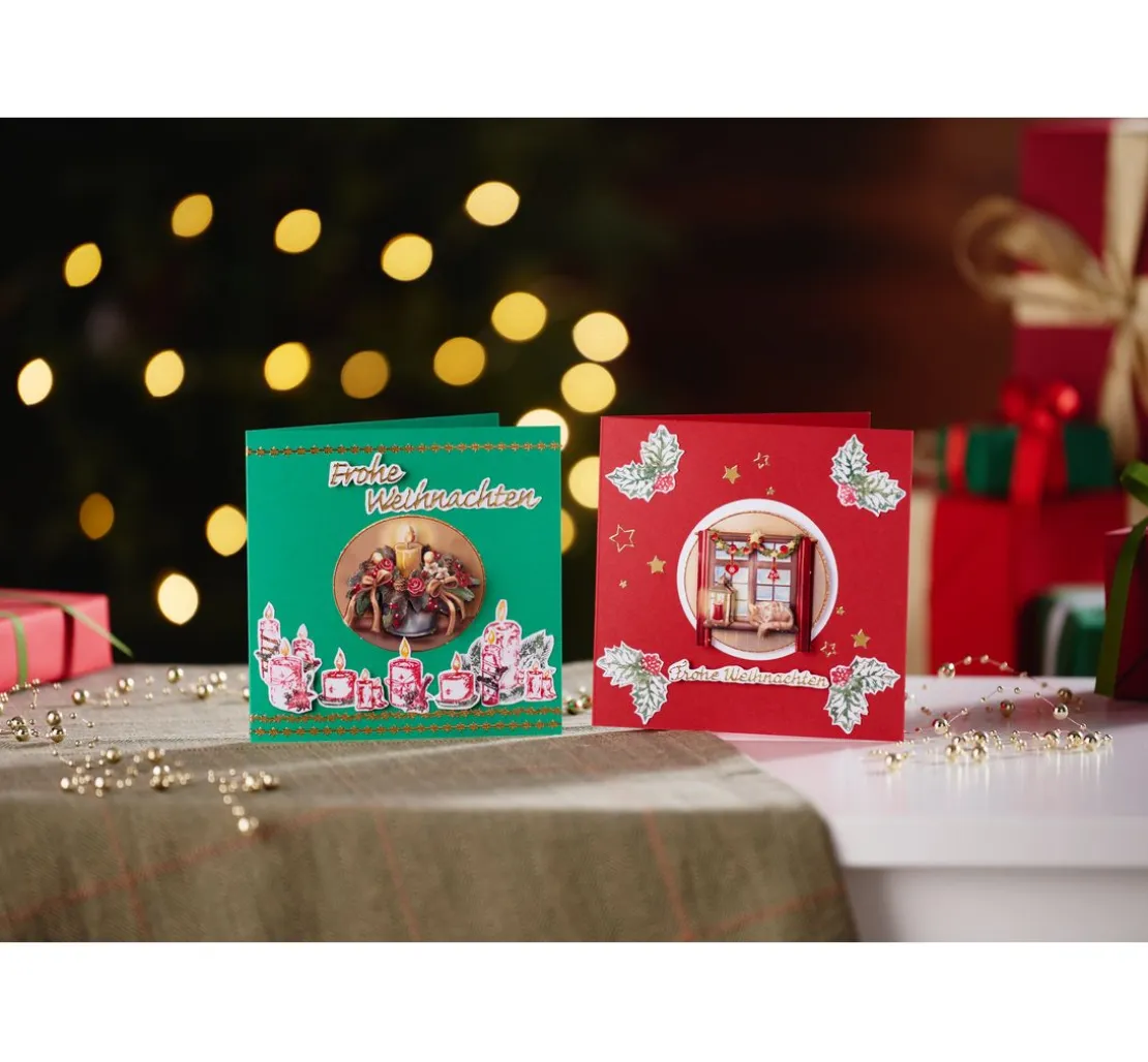 Von Blumenarrangements mit Kerzen und gemütlich weihnachtlich dekoriertem Zimmer bis hin zu Szenen mit Nussknacker, Rotkehlchen und niedlichem Kätzchen sind weihnachtliche Motive enthalten. Individuelle Weihnachtsgrußkarten, tolle Geschenkverpackungen, Schachteln und auch Scrapbook-Alben lassen sich klasse gestalten. Die vorgestanzten Motive lassen sich ganz leicht heraustrennen und mit Klebekissen kann der eindrucksvolle 3D-Effekt erzielt werden.