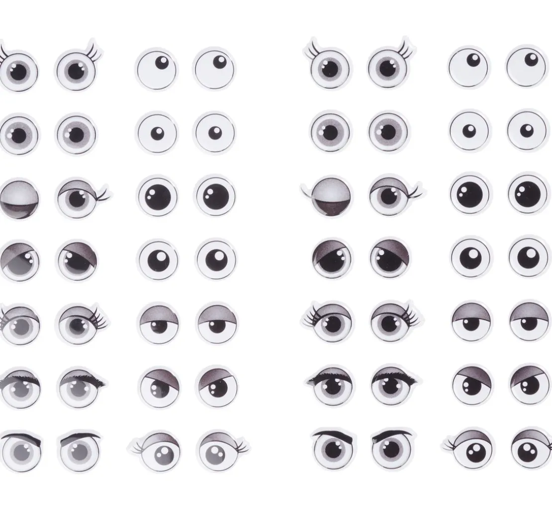 Lustige 3D Sticker „Augen“ mit einem Ø von ca. 10 mm. Die 28 Augenpaare verteilen sich auf 2 Bogen.