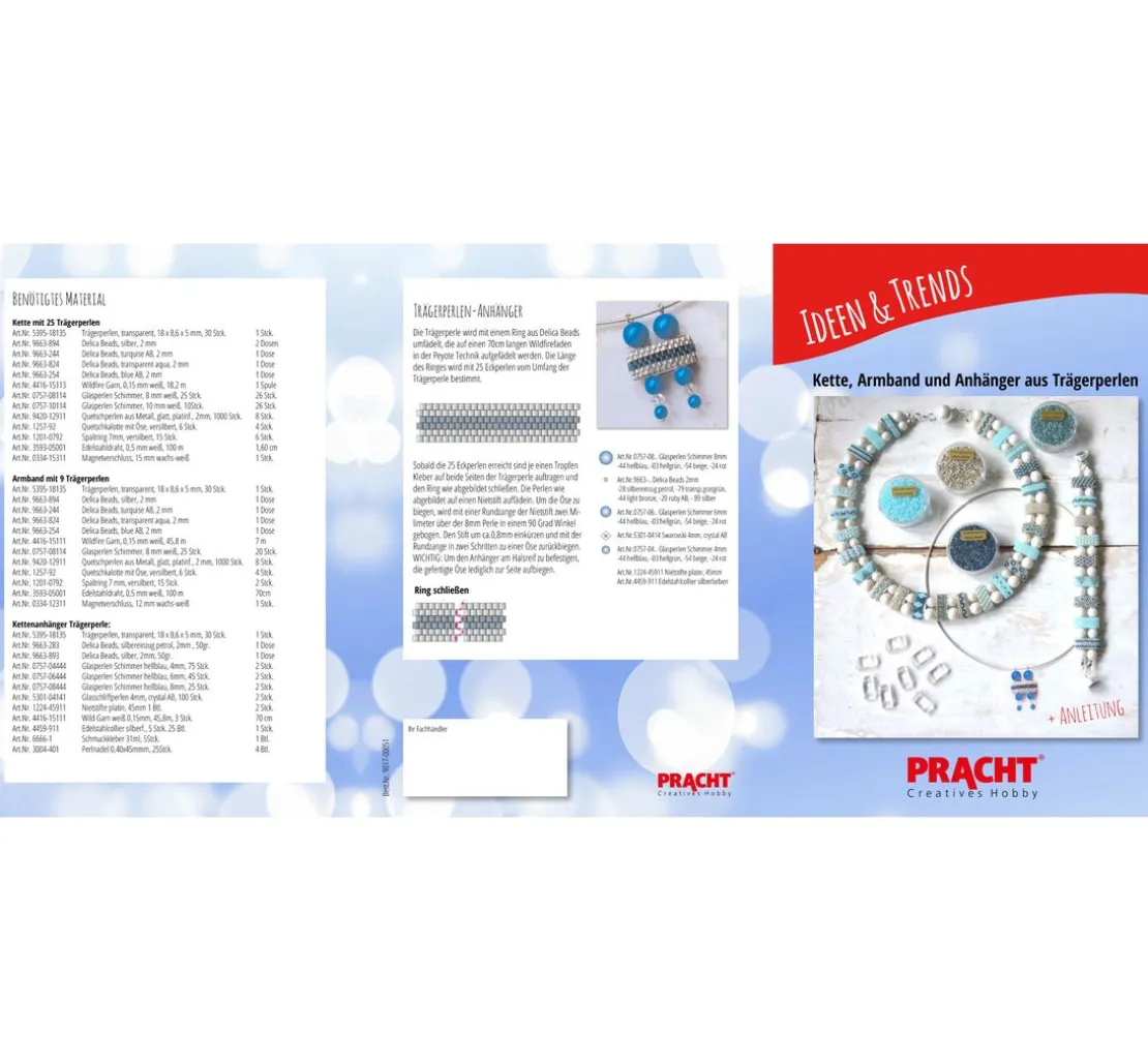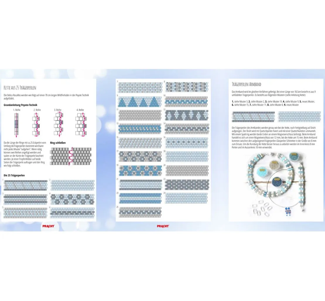 Bei einer Kette mit Trägerperlen wird zum Beispiel die Delica Rocailles auf einen 70 cm langen Wildfirefaden in der Peyote Technik aufgefädelt. Hier können auch hübsche Muster gefädelt werden. Nun kommt auf beide Seiten der Trägerperle ein Tropfen Kleber. Der noch nicht geschlossene Ring aus Rocailles wird erst auf der Trägerperle geschlossen.