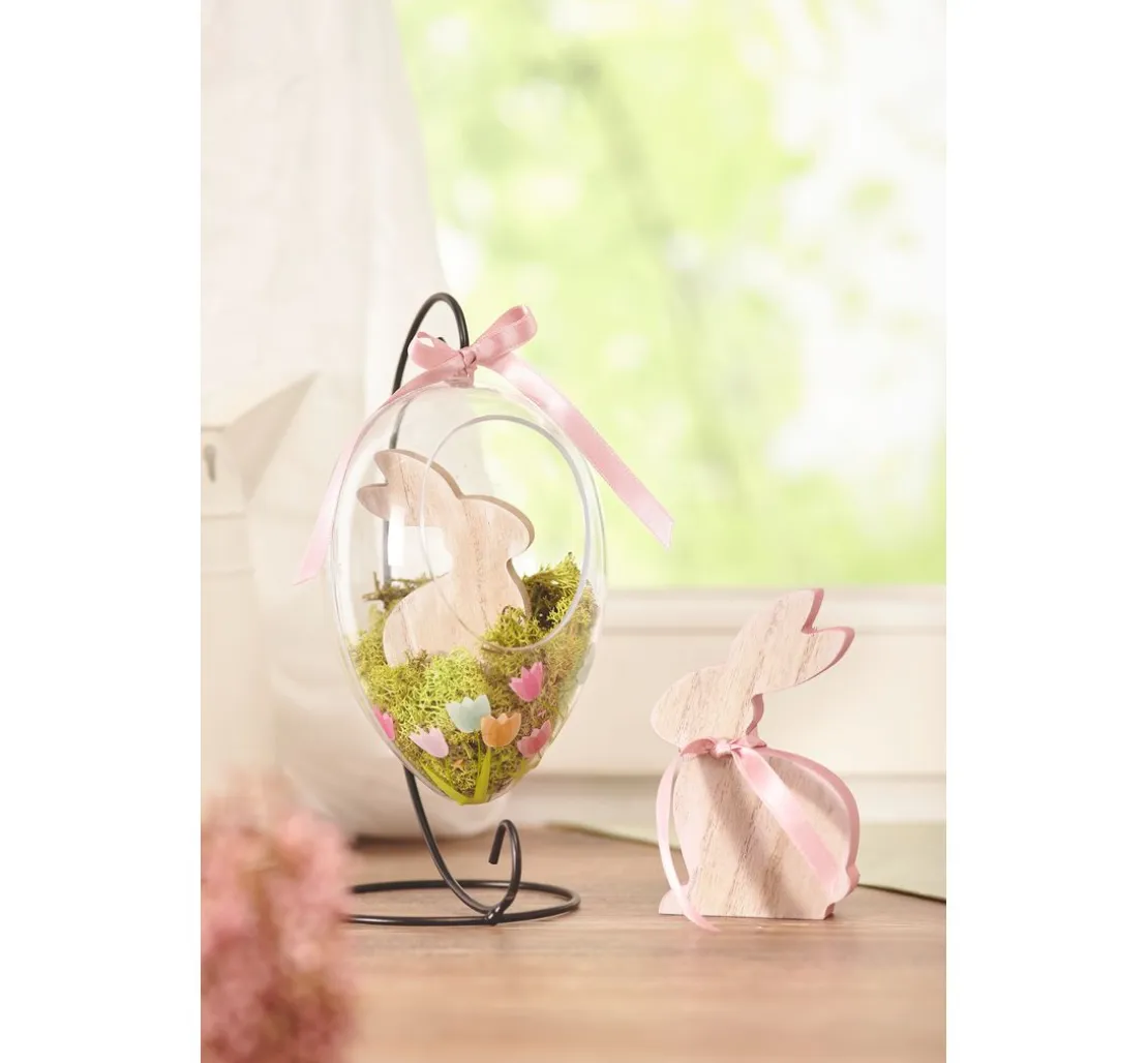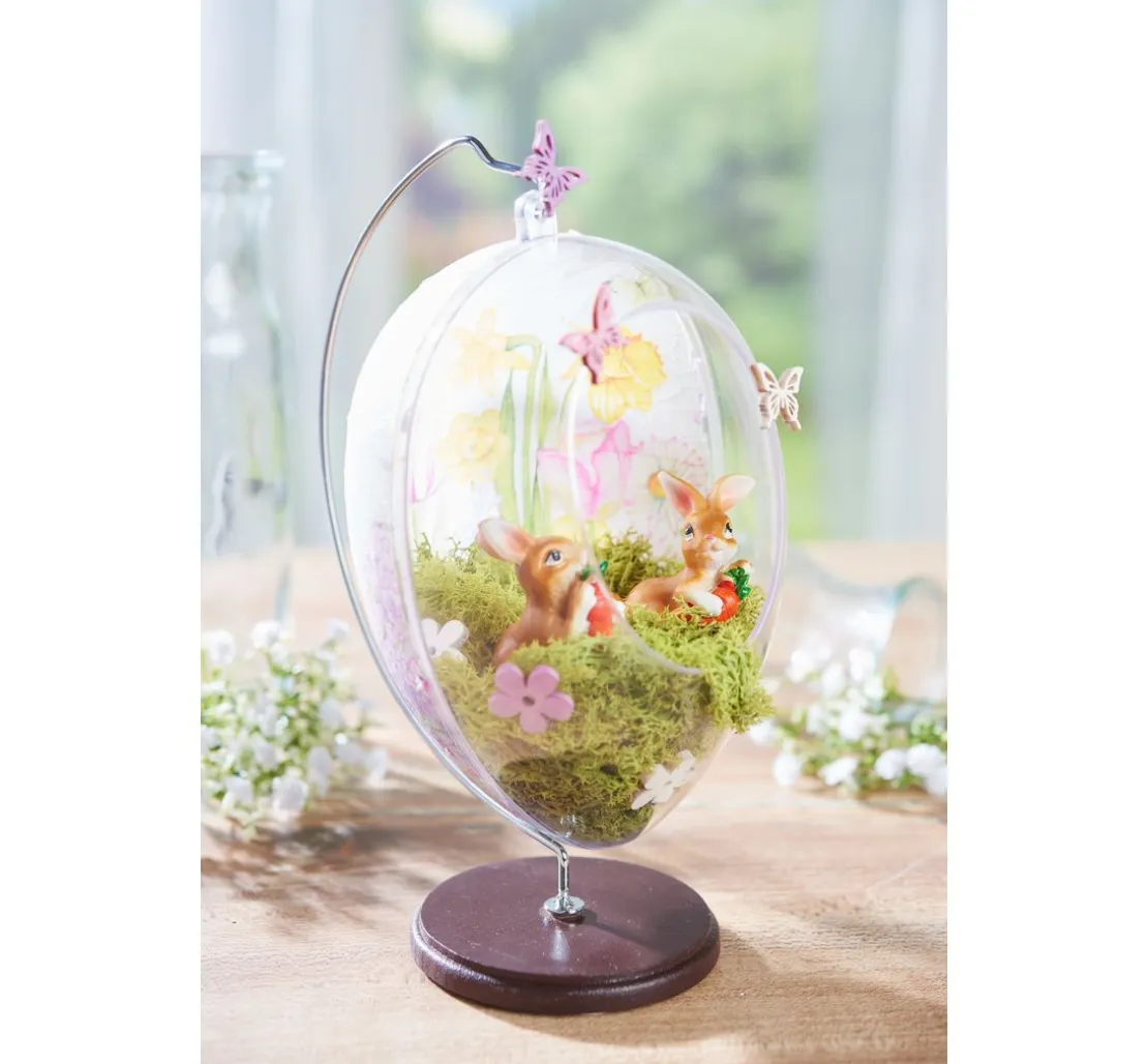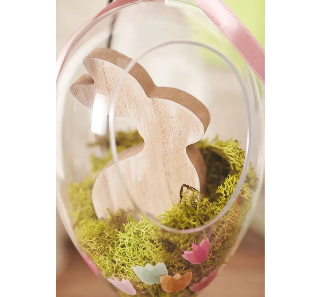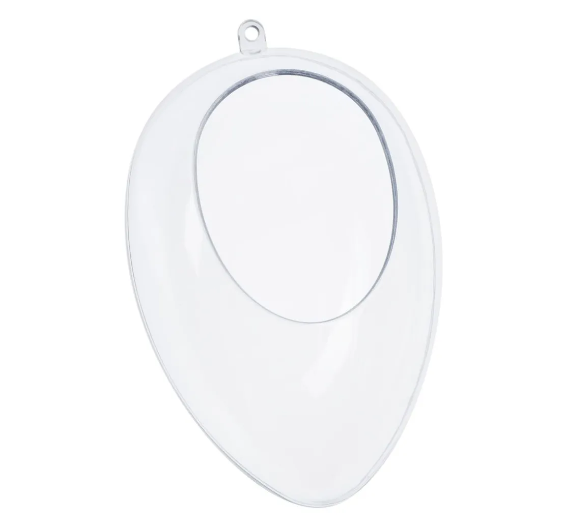 Eine außergewöhnliche transparente Acrylform: Das Acrylei „Floristik“, 16 cm aus glasklarem Material ist teilbar, mit einer Öffnung an der Vorderseite und einer Aufhängeöse. Die Öffnung an der Vorderseite hat eine Höhe von ca. 8,4 cm und eine Breite von ca. 6,3 cm.