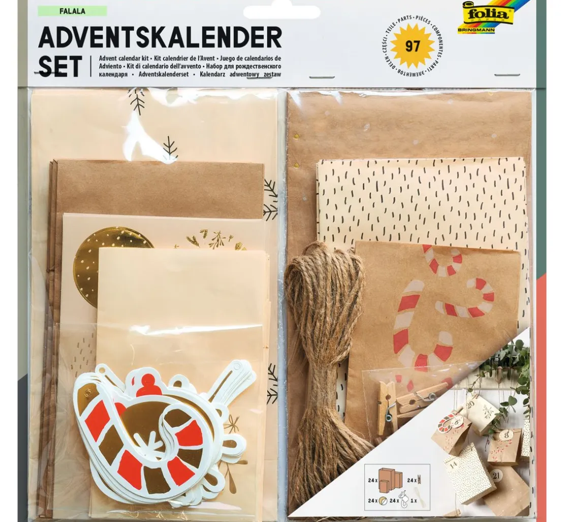 Dieses wunderschöne Adventskalender-Set „Falala“ bringt alles an Material mit, was benötigt wird, um einen zauberhaften Adventskalender zu gestalten. Die 24 Blockbodenbeutel in 6 Designs mit schönem Motivdruck und Folienveredelung haben eine Größe von ca. 12,0 x 6,0 x 21,0 cm, 10 x 5,5 x 17,5 cm und 8,0 x 4,5 x 13,0 cm.