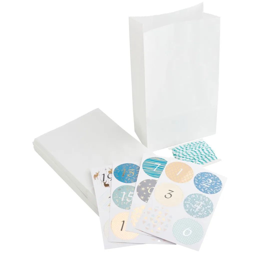 Mit diesem Set geht das Herstellen eines hübschen Adventskalenders oder kleinen Geschenkverpackungen ganz leicht. Dekorieren Sie die Tüten mit den Stickern und der Baumwollkordel und schon kann mit Süßigkeiten und kleinen Geschenken befüllt werden. Natürlich können Sie die Optik mit einem eigenen Handlettering, Washi-Tape, Schleifenband, Serviettentechnik, Schablonen oder Strohseide noch individuell verschönern. Ein wunderbares Set mit viel Spielraum für die eigenen Ideen.