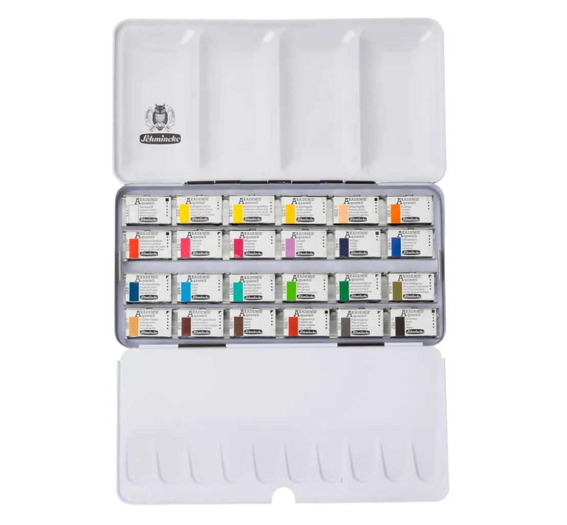 AKADEMIE Aquarellkasten mit 24 ganzen Näpfchen aus dem Hause Schmincke in einer Top-Qualität für Einsteiger und Fortgeschrittene. Ein hochwertiger und professioneller Metallkasten mit einem Metallring an der Unterseite für festen Halt in der Hand. Innen im Kasten ist eine Metallpalette zum Mischen der Farben, welche gleichzeitig als Abdeckung für die Farben dient. Dieser schöne und große Aquarellkasten lässt keine Wünsche offen.