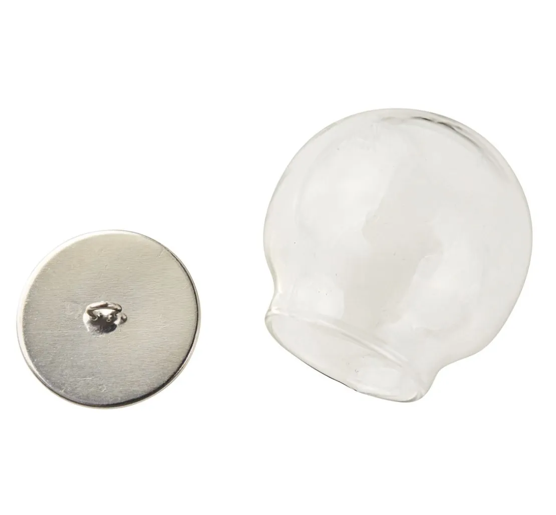 Der Anhänger „Glaskugel“ ist 2-teilig und hat einen Ø von ca. 30 mm. Die Kugel ist aus ca. 1,3 mm dünnem Glas und die Öffnung der Kugel hat einen Ø von ca. 17 mm. An der Abdeckung aus Metall befindet sich an der Innen- und Außenseite je eine Öse mit einem Ø von ca. 2,3 mm.
