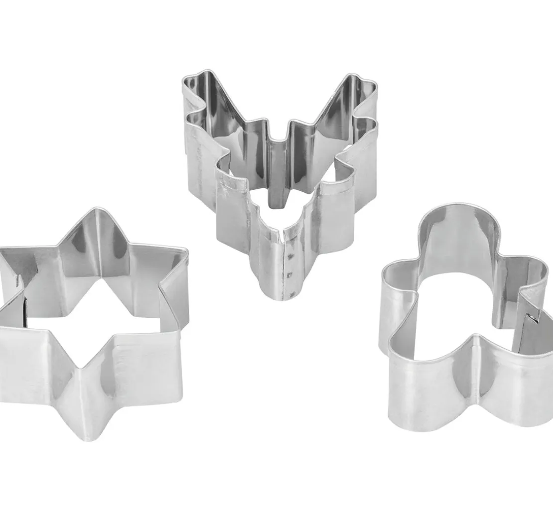 Weihnachtliches Ausstechformen Set „Christmas“ mit den 3 Formen Rentierkopf, Stern und Lebkuchenmann in einer Größe zwischen ca. 3,5 – 5 cm. Die Ausstecher sind aus Edelstahl gefertigt und sollten nach der Benutzung per Hand mit Wasser gereinigt werden.