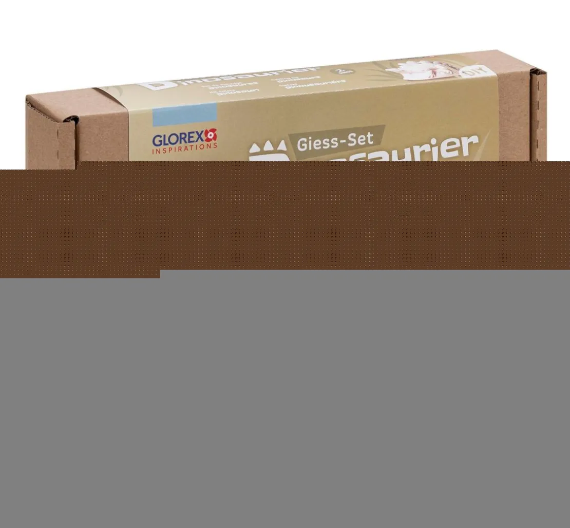 Das Bastelset „Dino“ enthält 6 Teile, dazu gehören auch die Farben: Grün und Schwarz. Die Farben sind untereinander mischbar. Ohne die Zugabe des Farbpulvers bleibt der Dinosaurier weiß und kann bemalt werden. Die Latexformen können mehrmals verwendet werden.