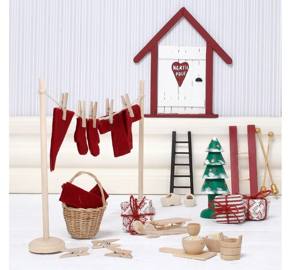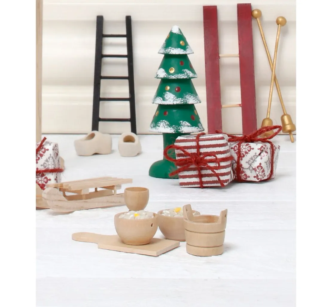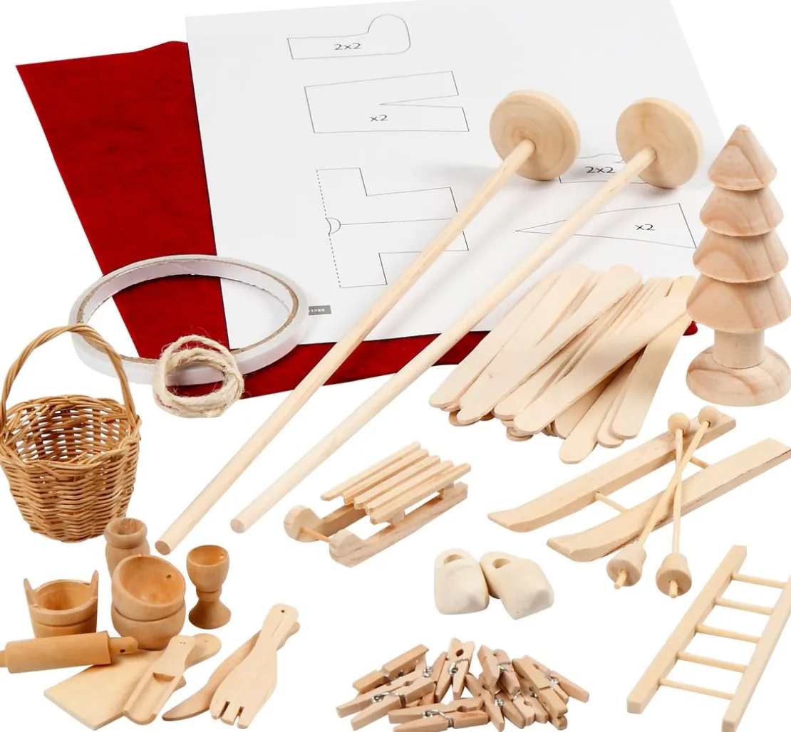 Das kleine Wichtel-Zuhause lässt sich mit Leiter, Schuhen, Wäscheleine, Küchenutensilien, Schlitten und weiteren enthaltenen Teilen im Miniaturformat wohnlich herrichten. Die schlichten Holzteile können wunderbar mit Bastelfarben bemalt werden. Aus dem Filz lassen sich mithilfe der Schnittmuster kleine Kleidungsstücke wie Mütze, Schal und Mantel ausschneiden. Zusätzlich kann mit ein wenig Deko-Schnee und einer Lichterkette die Miniaturwelt vervollständig werden.