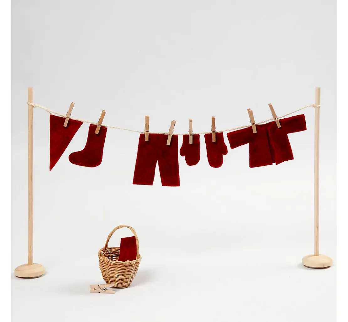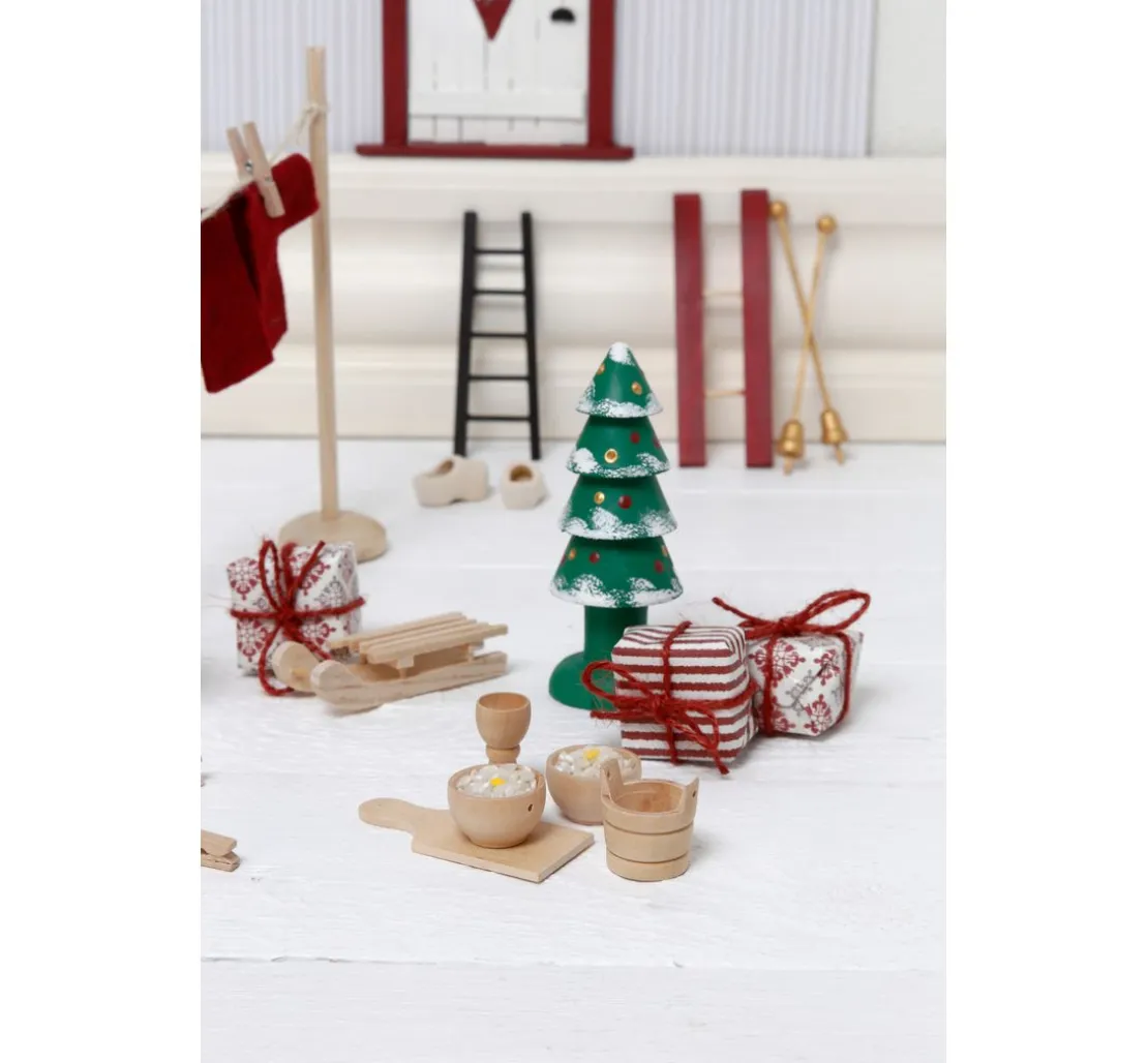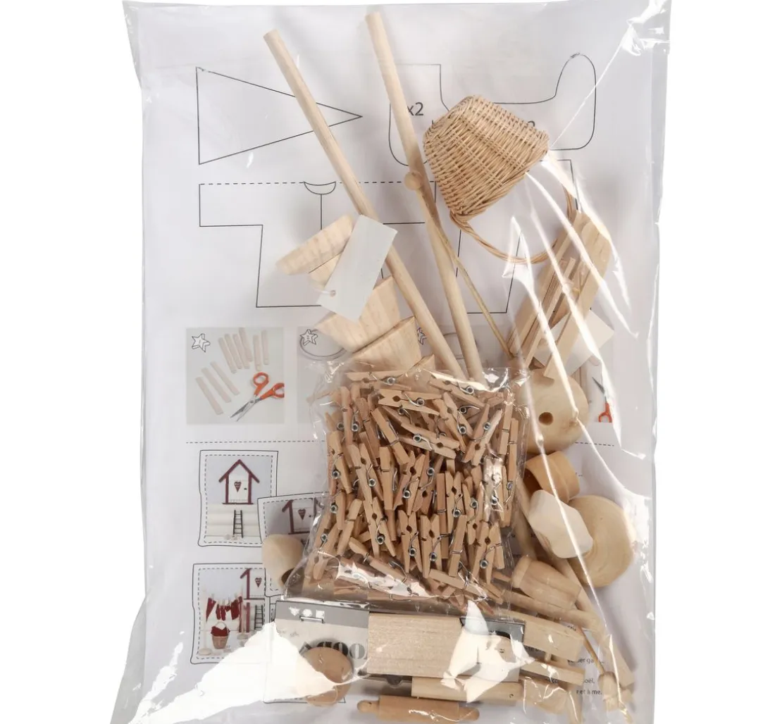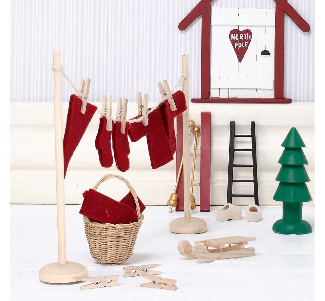 Das kleine Wichtel-Zuhause lässt sich mit Leiter, Schuhen, Wäscheleine, Küchenutensilien, Schlitten und weiteren enthaltenen Teilen im Miniaturformat wohnlich herrichten. Die schlichten Holzteile können wunderbar mit Bastelfarben bemalt werden. Aus dem Filz lassen sich mithilfe der Schnittmuster kleine Kleidungsstücke wie Mütze, Schal und Mantel ausschneiden. Zusätzlich kann mit ein wenig Deko-Schnee und einer Lichterkette die Miniaturwelt vervollständig werden.