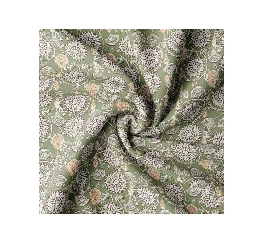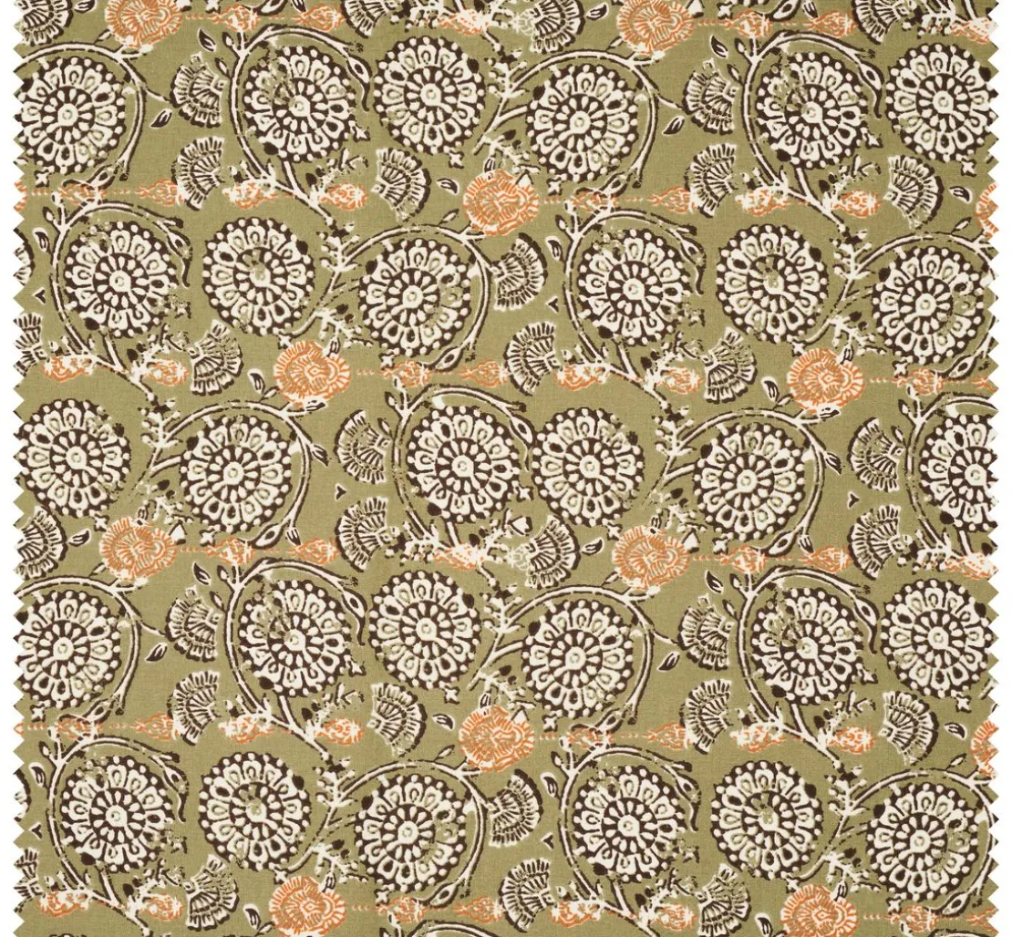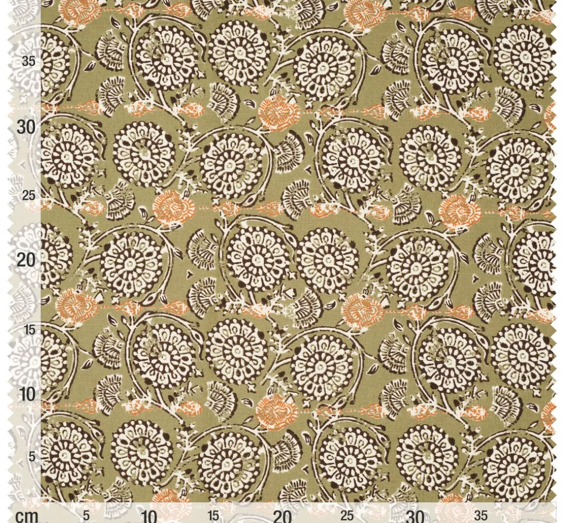 Der Baumwoll-Stoff „Jivana-Khaki“ ist eine Meterware mit einer Breite von ca. 150 cm. Das Material ist 100 % Baumwolle und waschbar bei 30 °C Feinwäsche. Von der Gesamtbreite sind ca. 147 cm mit dem Motiv bedruckt. Es wird empfohlen, den Stoff vor dem Nähen zu waschen. Der Schrumpfungsgrad beträgt max. ca. 6 %. Eine leichte Qualität die sich gut mit einer handelsüblichen Nähmaschine verarbeiten lässt