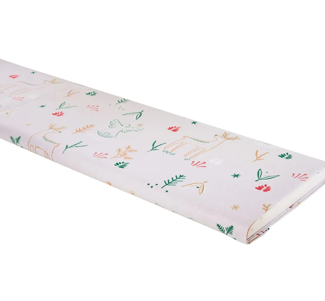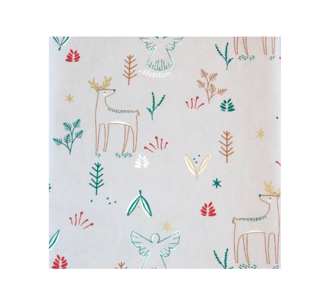 Der Baumwoll-Stoff „Reindeer Magnus“ hat eine Breite von ca. 150 cm und besteht aus 100 % Baumwolle. Die Meterware hat ein Stoffgewicht von ca. 115 g/m² und ist waschbar bei 40° C Feinwäsche. Die Motivgröße beträgt ca. 0,9 – 7,5 cm. Auf hellem Hintergrund sind Rentiere, Engel und Zweige aufgedruckt, die aussehen wie aufgestickt.
