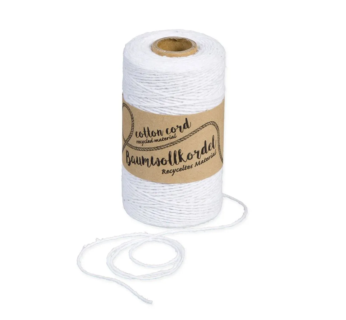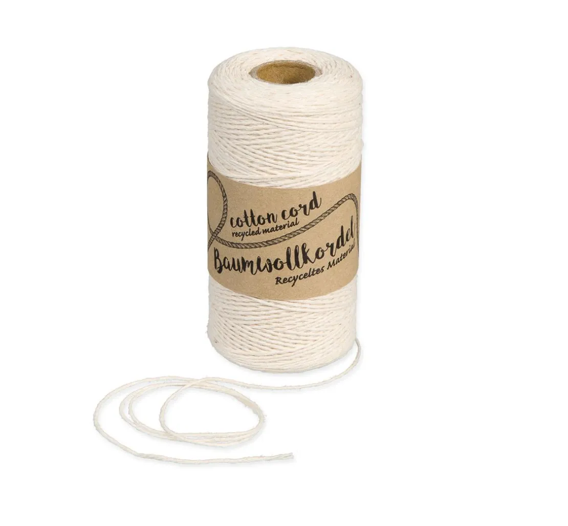Das Baumwollgarn mit einer Stärke von 1 mm besitzt eine Lauflänge von ca. 220 m und hat ein Gewicht von ca. 80 g. Ein Häkelgarn aus 90 % recycelter Baumwolle und 10 % sonstige Fasern.