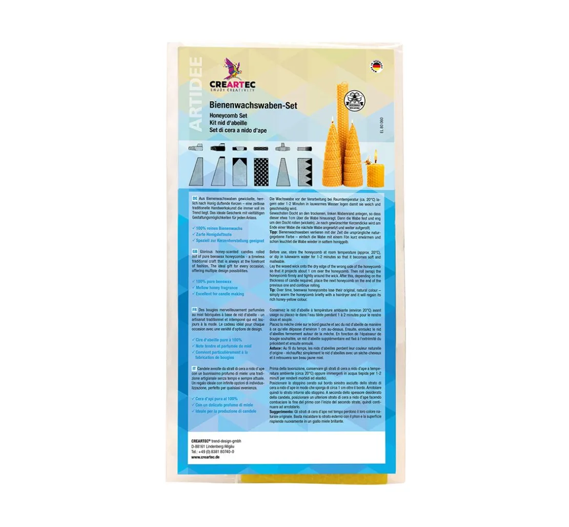Die Wachswaben vor der Verarbeitung bei Zimmertemperatur aufbewahren oder für 1 – 2 Minuten in lauwarmes Wasser legen. Somit werden sie weich und lassen sich perfekt verarbeiten ohne zu brechen. Nun den Docht am linken, trockenen Rand anlegen, an einer Seite ca. 1 cm überstehen lassen und schon kann das Wickeln beginnen. Je nachdem wie dick die Honigkerze werden soll einfach am Ende die nächste Wachswabe anlegen. Auf der Rückseite der Verpackung befinden sich einige Beispiele für verschiedene Wickeltechniken.