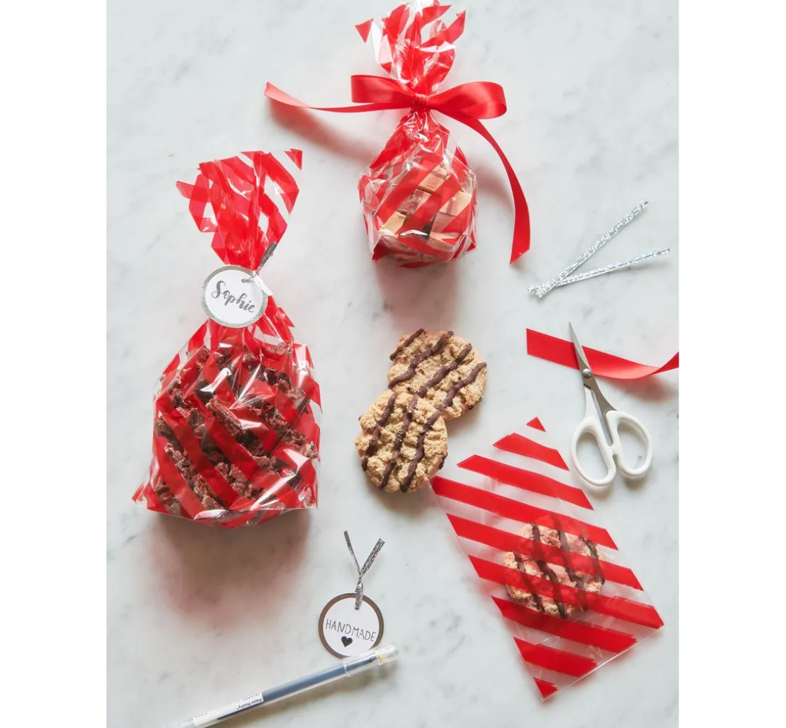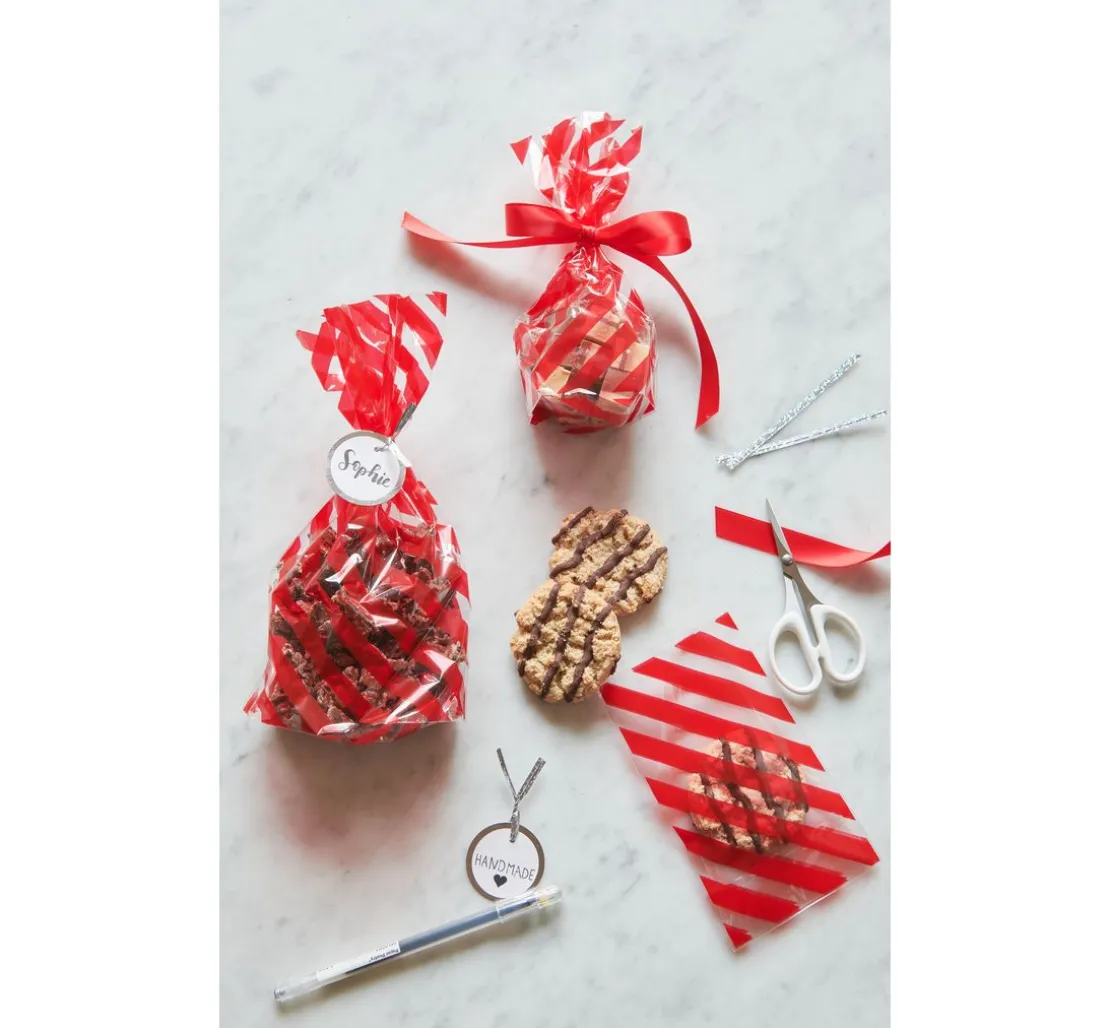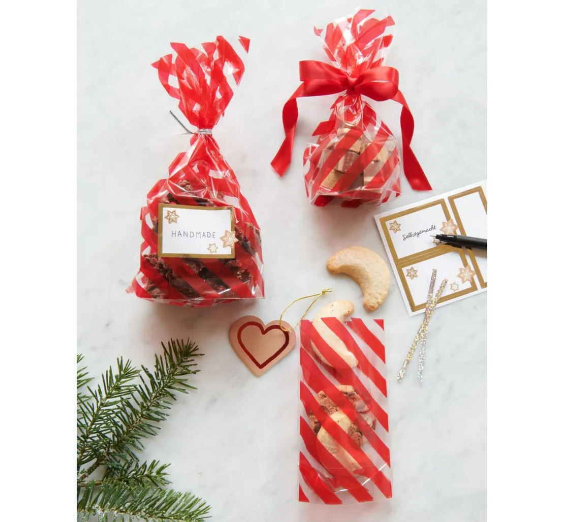 Verleihe deinen selbstgemachten Leckereien den perfekten Rahmen mit unseren Bodenfaltenbeuteln „Rote Streifen“. Diese eleganten Zellglasbeutel aus Polypropylen (PP), die in einer Packung von 10 Stück erhältlich sind, sind nicht nur ein Blickfang, sondern auch lebensmittelecht, was sie ideal für deine kulinarischen Kreationen macht. Ob Kekse, Pralinen oder andere Köstlichkeiten – diese Beutel halten deine Geschenke frisch und ansprechend.