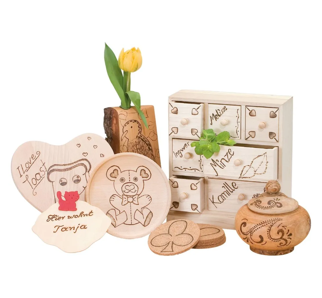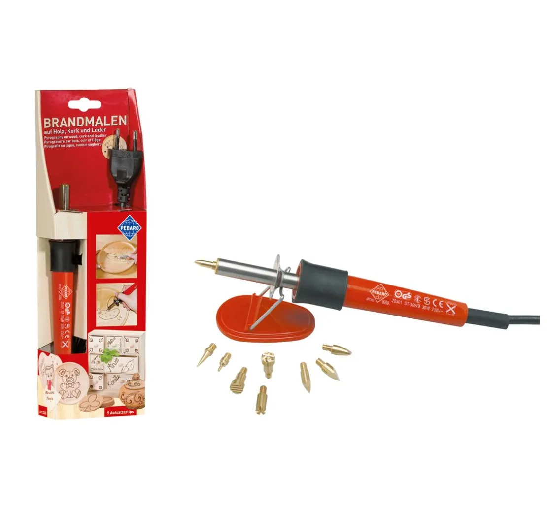 Der einzelne Brandmal-Pen ist Ihr ideales Einstiegs-Werkzeug in das schöne und traditionelle Hobby Brandmalerei. Der handliche Brennstab kann mit unterschiedlichen Brennspitzen und Brennstempeln bestückt werden, so dass Sie verschiedene Strichstärken brennen können. Brandmalen können Sie auf Holz-, Leder- und Korkoberflächen. Mit praktischem Ablageständer für die heißen Brandmalspitzen, damit die Tischplatte nicht unbeabsichtigt verbrannt wird.