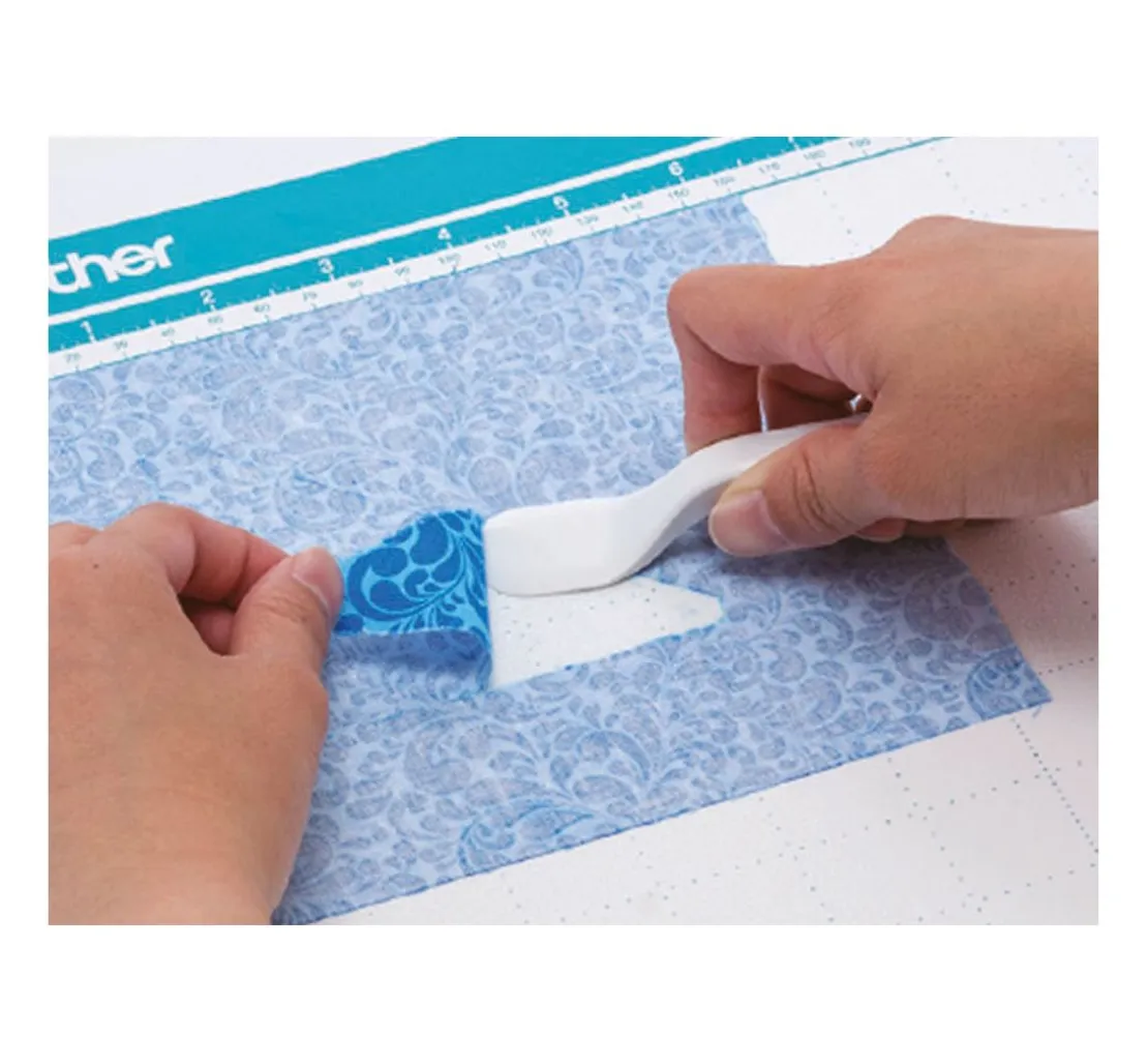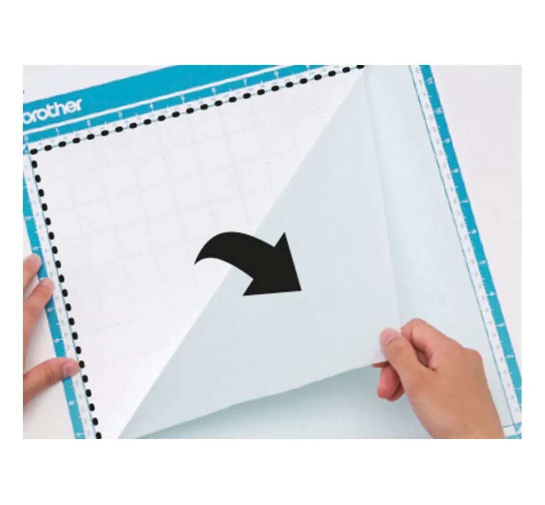 Zum Schneiden kann die Brother Standardmatte verwendet werden. (Standardmatte nicht mitgeliefert). Die Klebefolie verwenden Sie zum Schneiden von Mustern ohne Nahtzugabe das Aufbügelblatt für Stoffapplikationen (Aufbügelblatt nicht mitgeliefert).