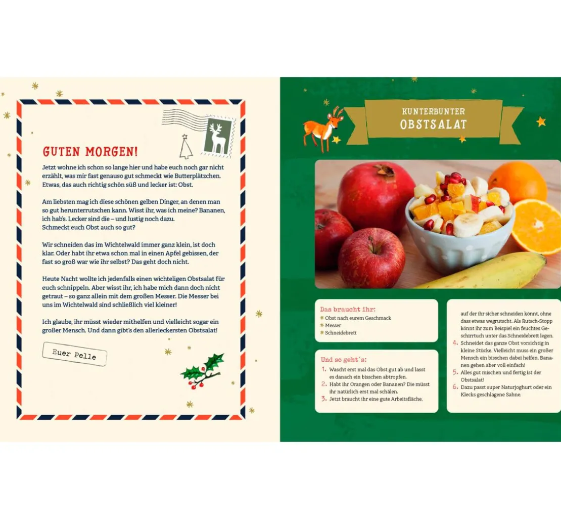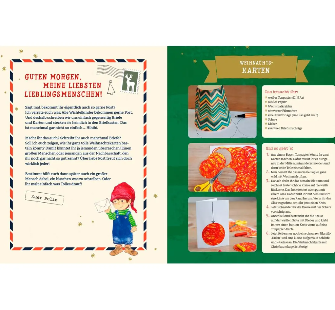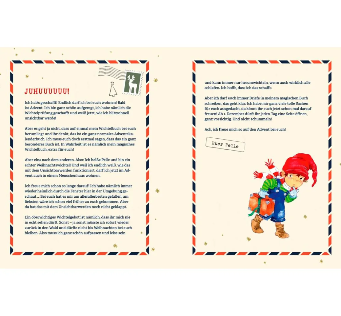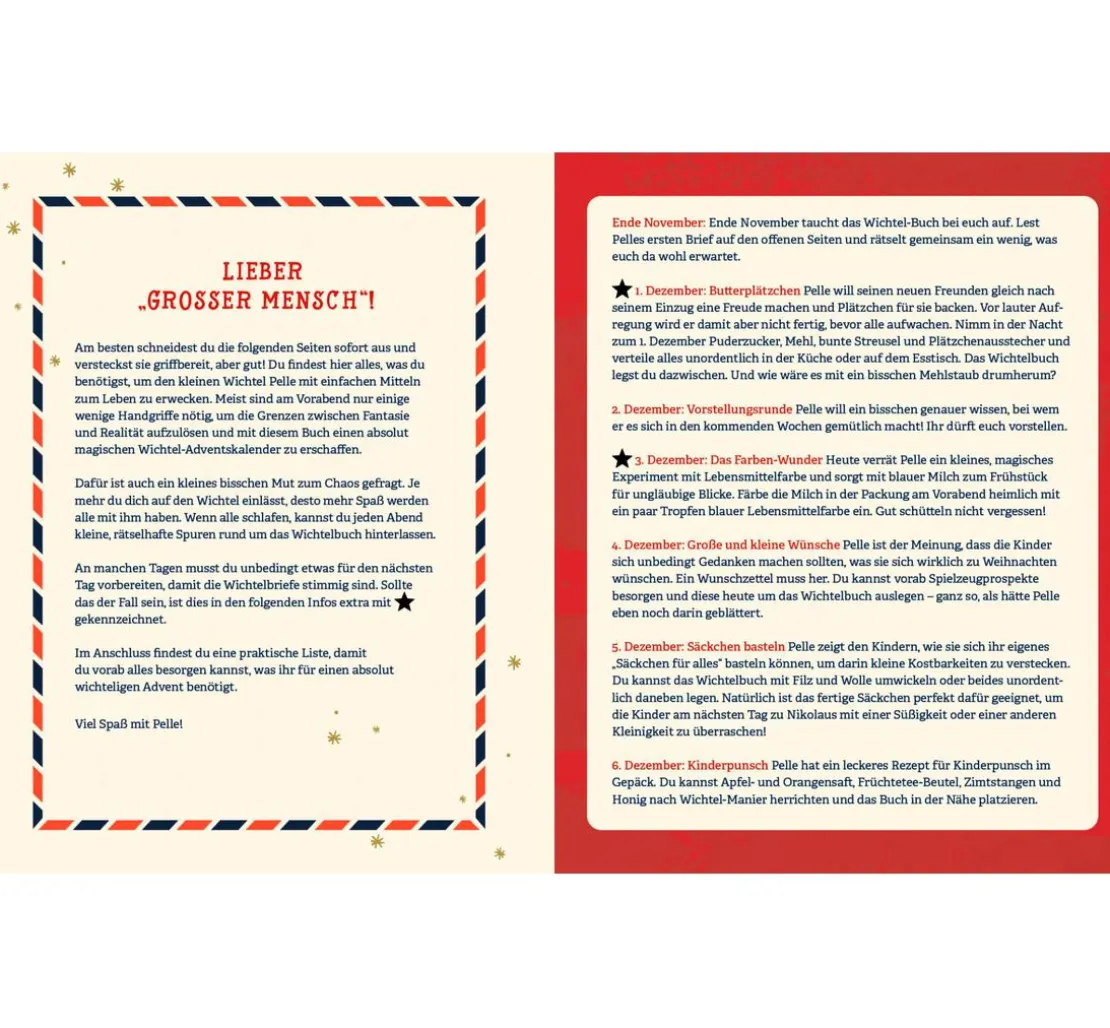 Es ist ein interaktiver Adventskalender für die ganze Familie, der euch jeden Tag einen neuen Wichtelbrief von Pelle zu lesen bietet. Mit dem Buch könnt ihr eure Weihnachtszeit zu einem unvergesslichen Erlebnis machen. Dank der perforierten Seiten könnt ihr die Ideen einfach aufteilen und ausprobieren. Das Buch ist eine tolle Ergänzung oder kann als Ersatz für die Wichteltür genutzt werden.