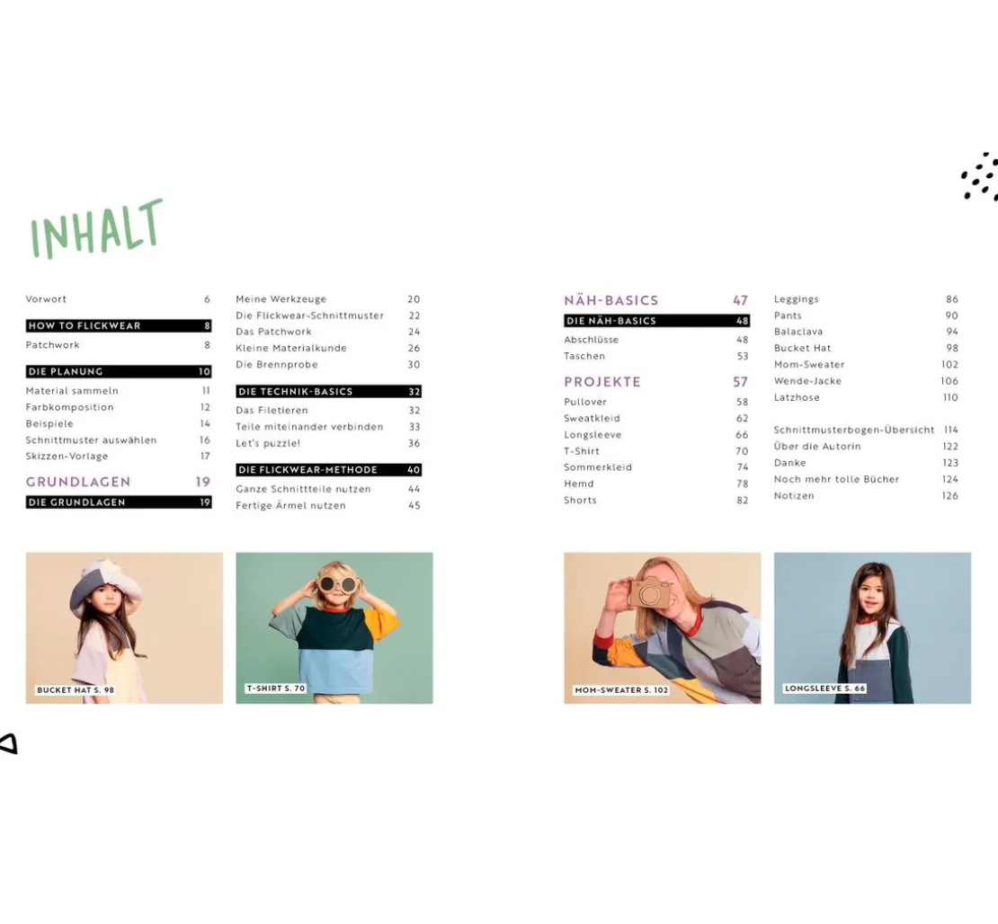Dank der innovativen FLICKWEAR-Technik von Lisa Eichas gestaltest du atemberaubende Stoffe aus kleinen Rechtecken und Kreisen. Mit zehn inspirierenden Schnittmustern für Größen von 74 bis 140 entstehen so niedliche Kleidungsstücke, die auch mal einen kreativen Sprung ins Reich der Erwachsenen wagen.
