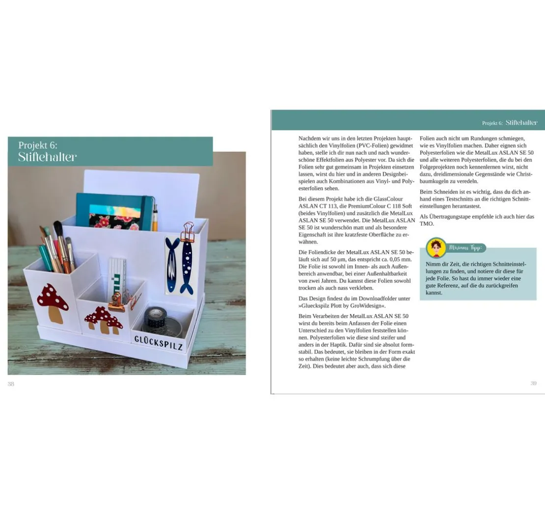 In 17 kreativen Plotterprojekten zeigt sie dir, wie du mit Vinylfolie arbeiten kannst. Ob Glas, Metall, Holz, Pappe oder Kunststoff – die Anwendungsmöglichkeiten sind unendlich. Die Designs der Projekte von Annett Grosse-Wilde (GroWidesign) stehen als DXF- und SVG-Dateien kostenlos zum Download für die gängigen Plotter von Brother, Silhouette und Cricut zur Verfügung.