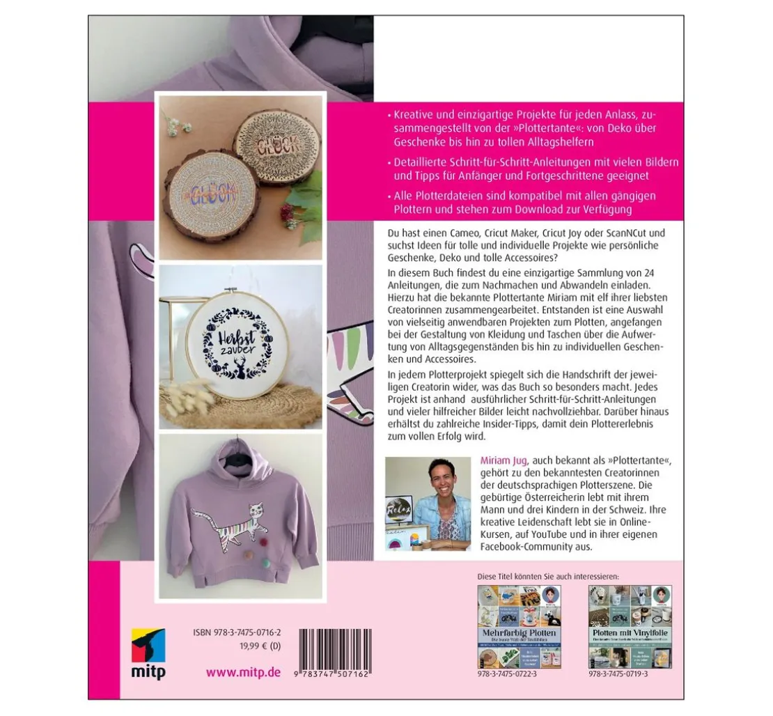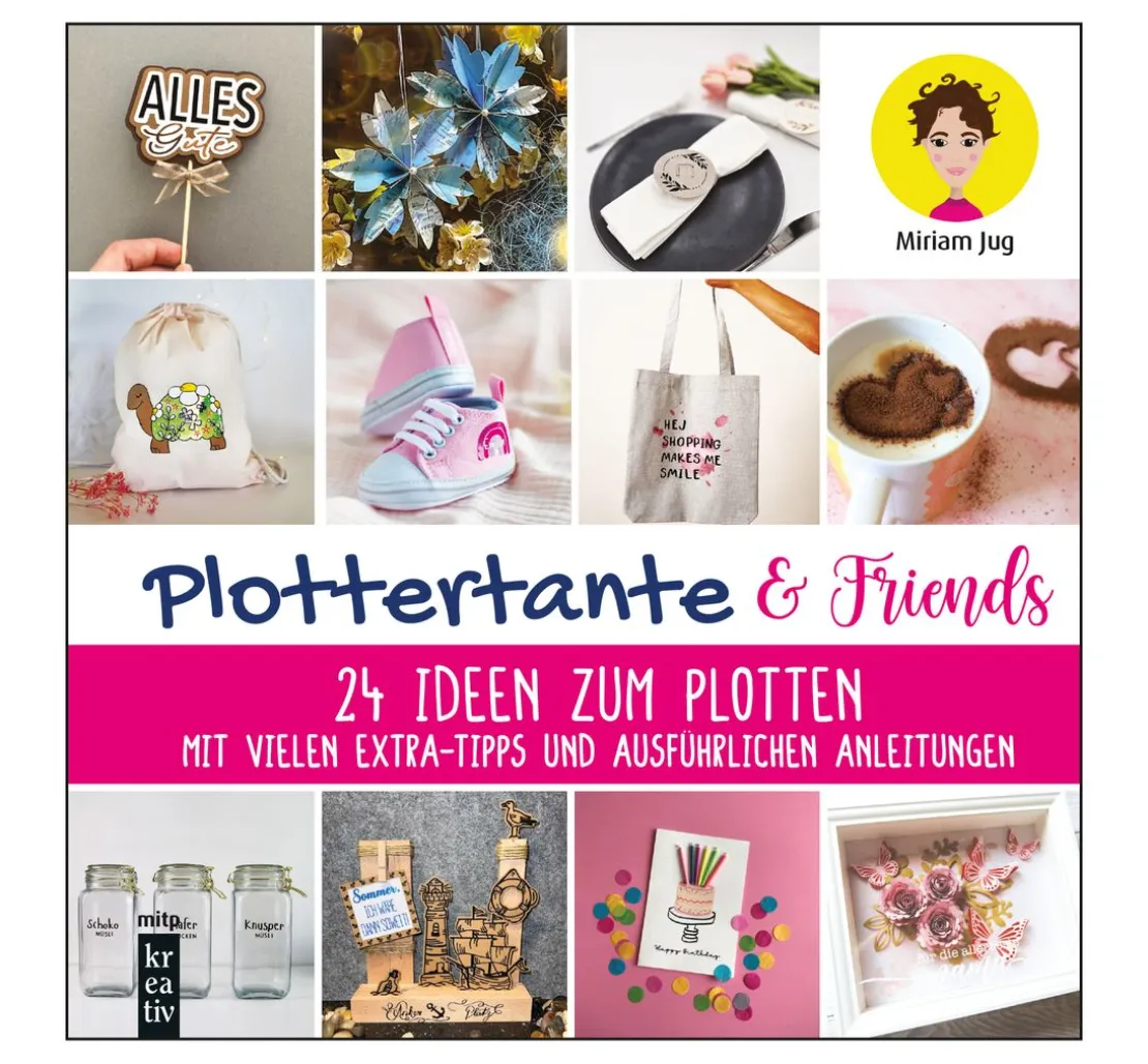 In dem Buch „Plottertante & Friends: 24 Ideen zum Plotten“ findest du eine einzigartige Sammlung von 24 Anleitungen, zusammengestellt von der bekannten Plottertante Miriam Jug und elf ihrer liebsten Creatorinnen. Egal ob du Anfänger oder Fortgeschrittener bist, die detaillierten Schritt-für-Schritt-Anleitungen mit vielen Bildern und Tipps machen es dir leicht, die Projekte nachzumachen und individuell anzupassen.
