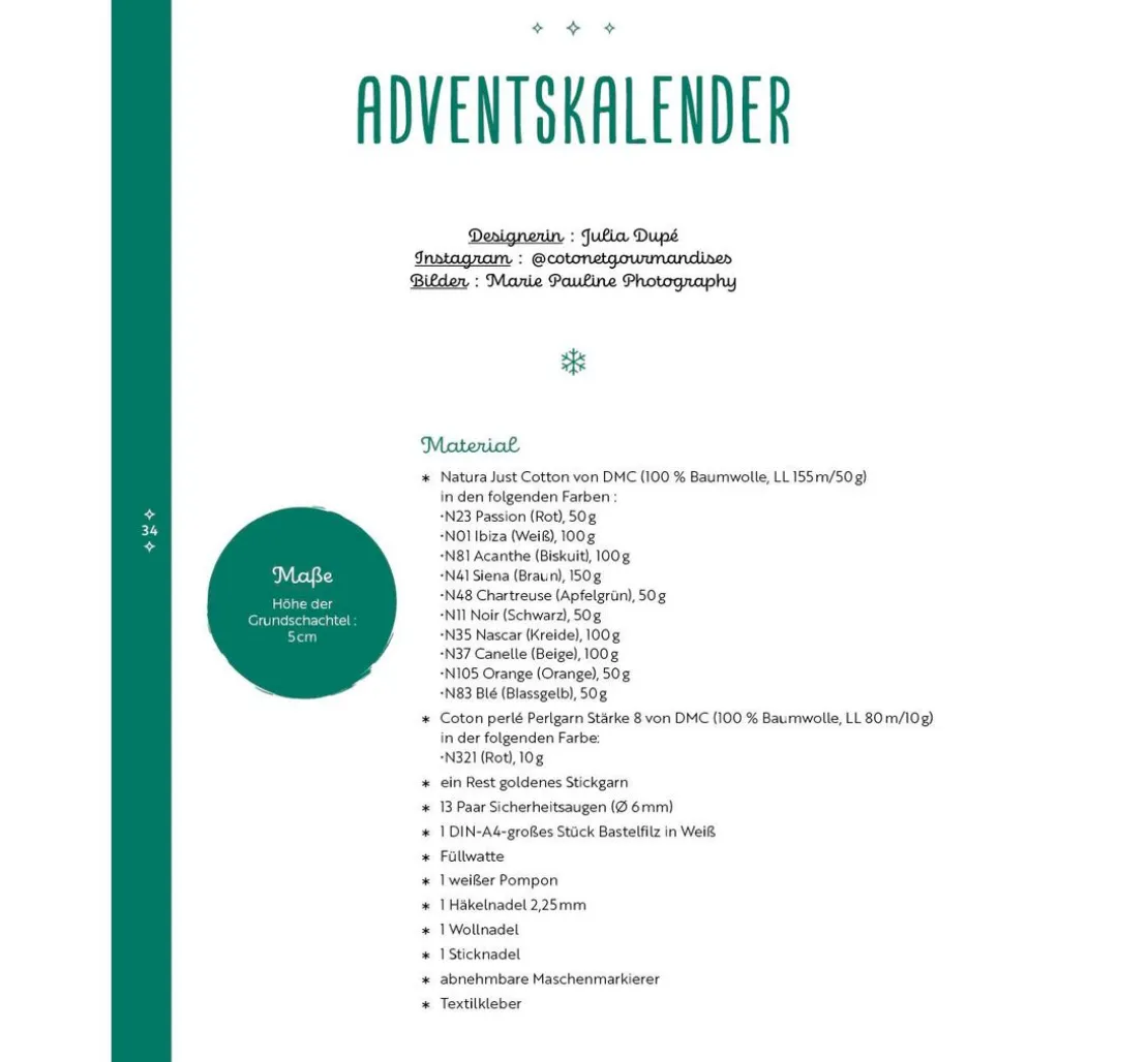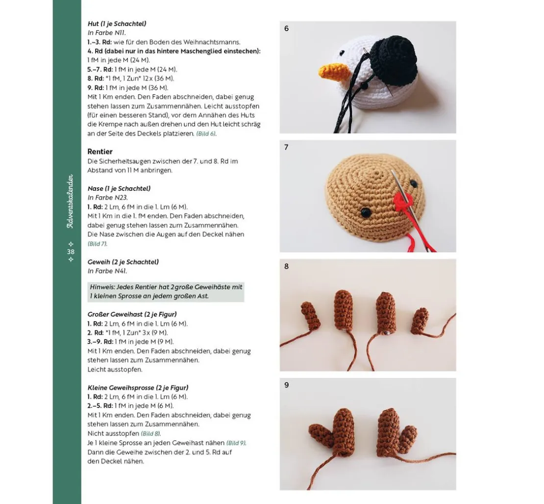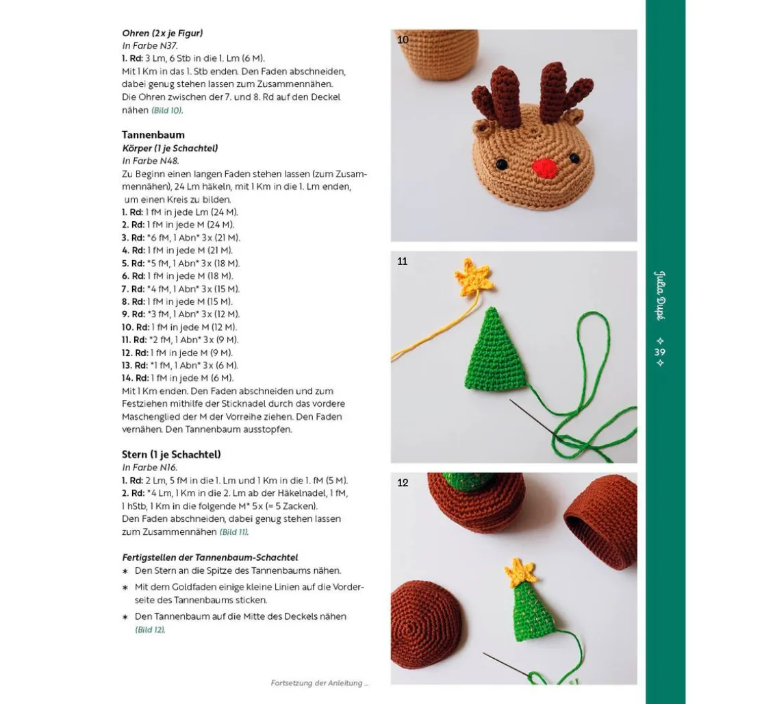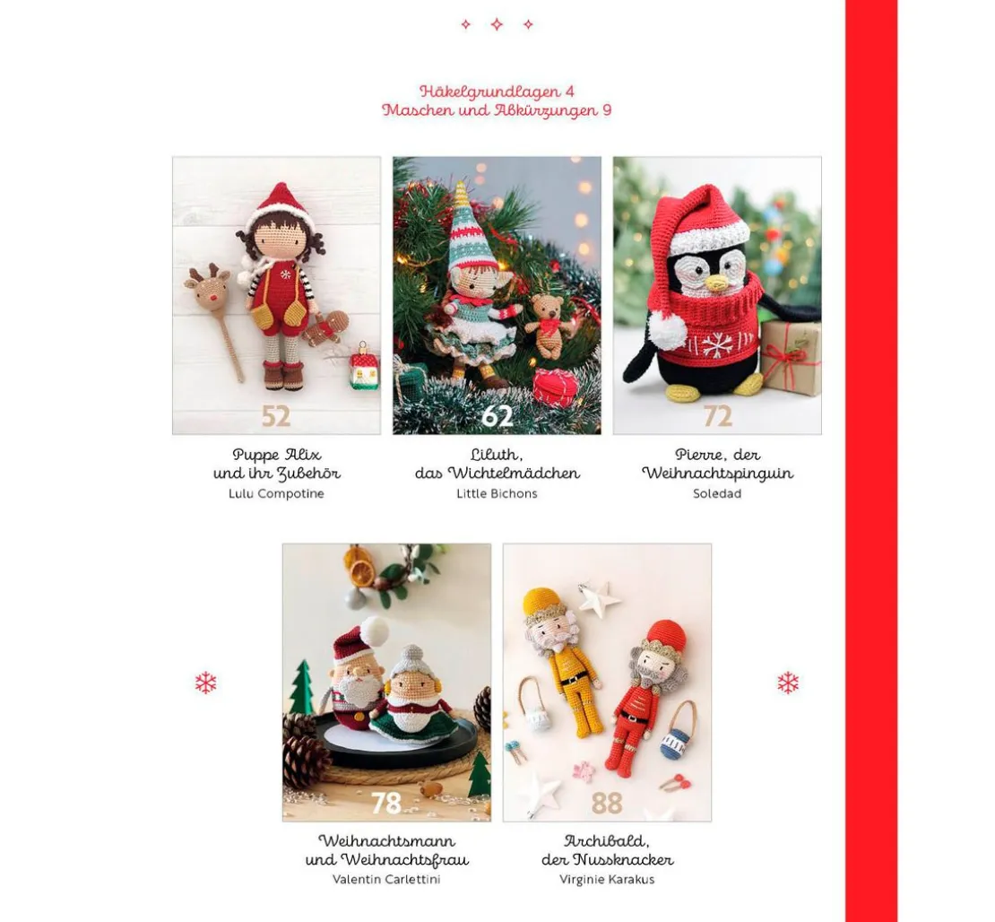 Mit 30 Anleitungen für Figuren und Accessoires, einer Anleitung für einen gehäkelten Adventskalender und zehn stimmungsvollen Weihnachtsszenen, die komplett durchfotografiert sind, kann die kreative Weihnachtszeit starten. Dank der ausführlichen Schritt-für-Schritt-Anleitungen, die auch für Anfänger*innen geeignet sind, kannst du schnell und einfach niedliche Weihnachts-Amigurumis und ihre treuen Begleiter wie Lebkuchenmann-Teddy, Rentier-Steckenpferd, Rudolf, Elf, Weihnachtsmann und Weihnachtsfrau zum Leben erwecken.