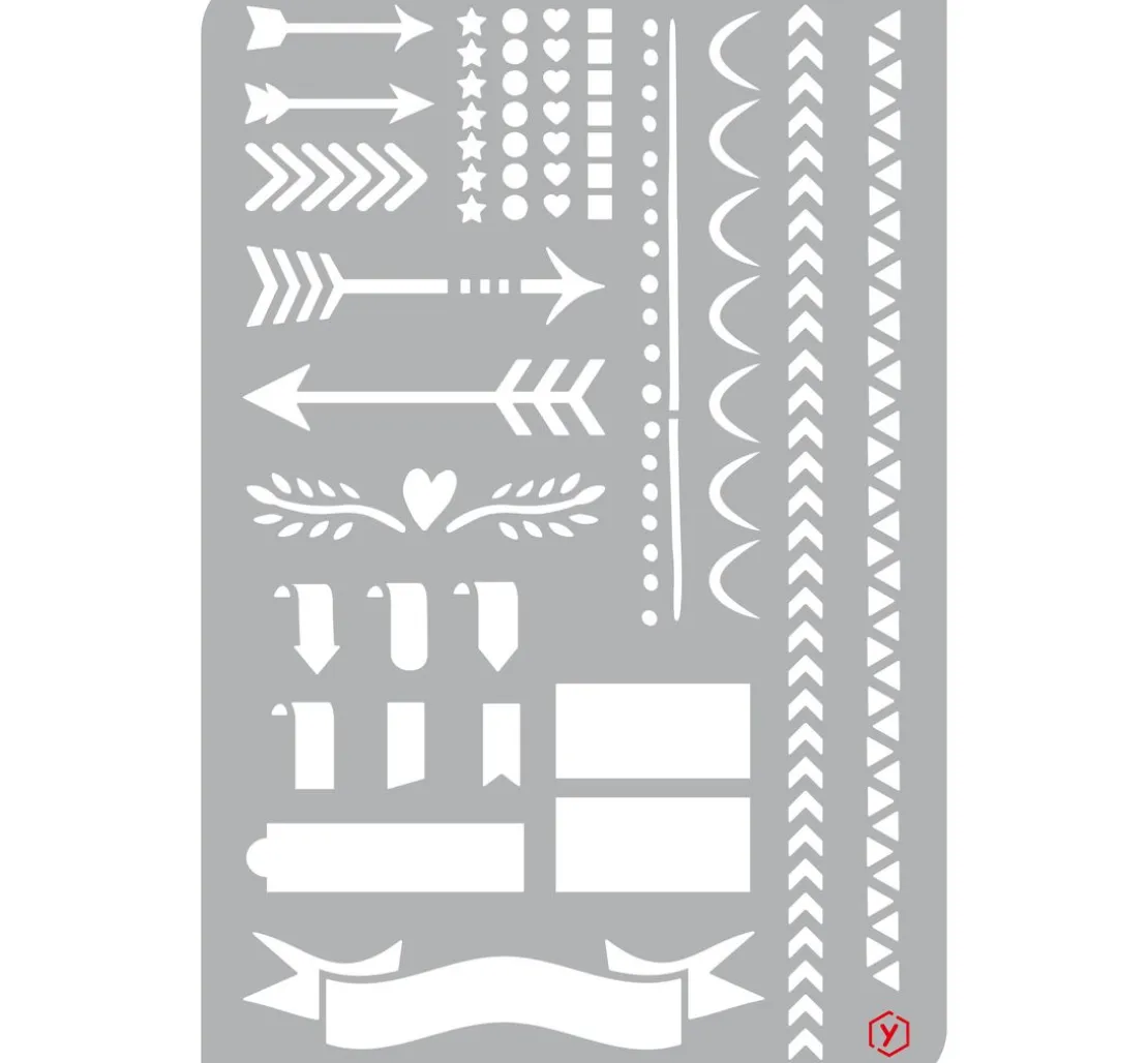 Mit dieser praktischen Vorlagenschablone wird das Hervorheben von wichtigen Dingen in Ihrem neuen Bullet Diary zum Kinderspiel! Die 25 Motive sind zum Beispiel Pfeile, Banner, verschiedene Borten und vieles mehr. So sehen die Seiten in Ihrem Planer immer unterschiedlich aus und wichtige Dinge werden hervorgehoben.