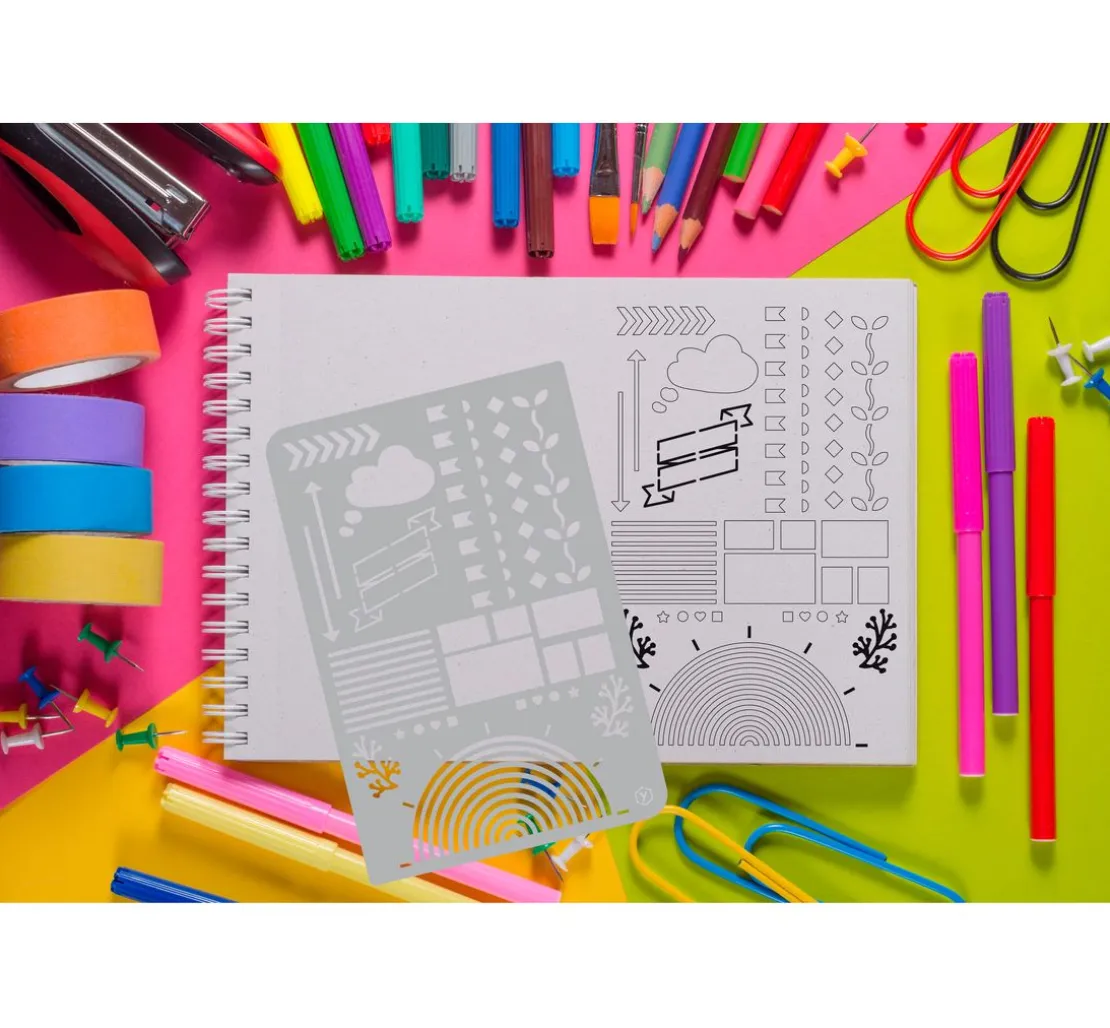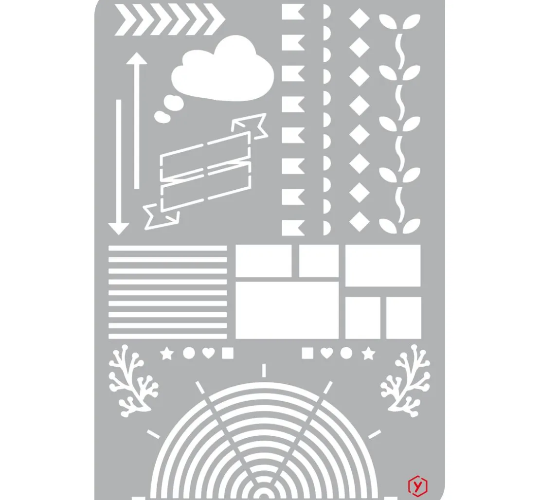 Mit dieser praktischen Vorlagenschablone wird das Hervorheben und Umranden von wichtigen Dingen in Ihrem neuen Bullet Diary zur Leichtigkeit! Die 27 Motive sind zum Beispiel Pfeile, Banner, verschiedene Kästchen, Borten und vieles mehr. So sehen die Seiten in Ihrem Planer immer unterschiedlich aus und wichtige Dinge werden hervorgehoben und unterstrichen.