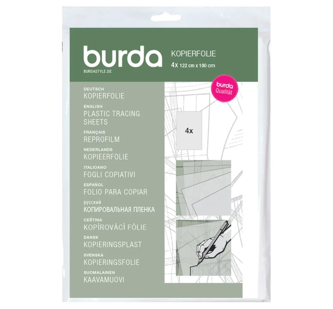 Burda Kopierfolie mit einer Größe von ca. 100 x 122 cm, Inhalt 4 Stück. Zum Abpausen von Schnittteilen vom Schnittbogen. Das Produkt besteht zu 80 % aus Recyclingmaterial und kann komplett recycelt werden.