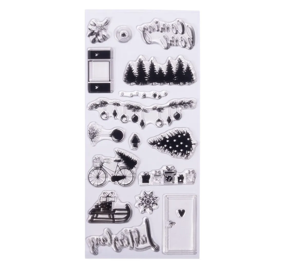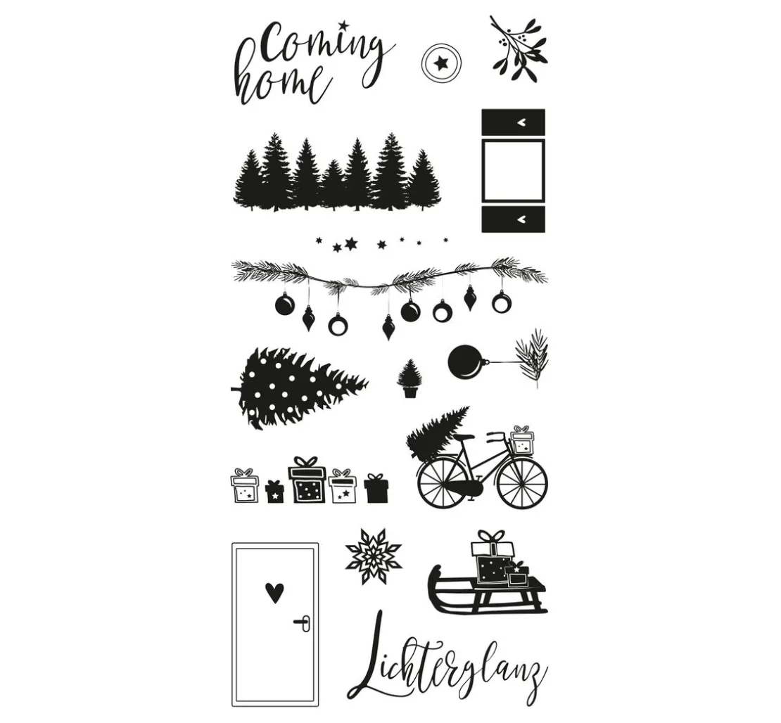 Mit den Clear Stamps „Coming Home“ kannst du deine Weihnachtsbasteleien ganz nach deinen Vorstellungen kreieren! Die 16 Silikonstempel zeigen verschiedene weihnachtliche Motive wie Schlitten, Tannenbaum, Zweige mit Kugeln, Geschenke, Schriftzüge und mehr. Damit sind deiner Kreativität keine Grenzen gesetzt.