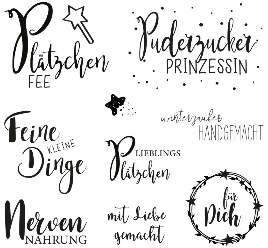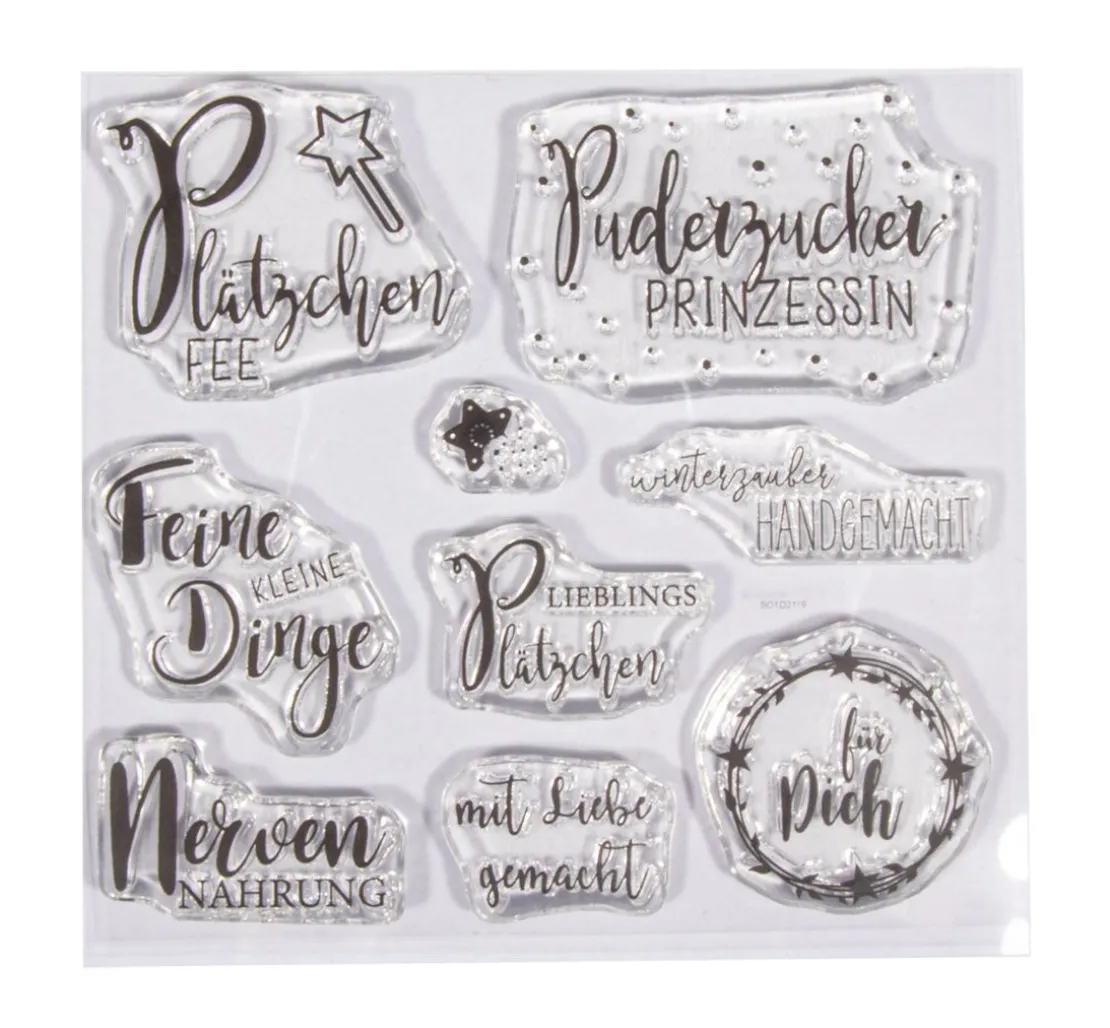 Schicke Clear Stamps „Süße Grüße“ mit einer Motivgröße von ca. 1,5 x 1,0 cm bis 5,2 x 3,5 cm aus Silikon. Das Stempel-Set besteht aus 9 Stempeln.