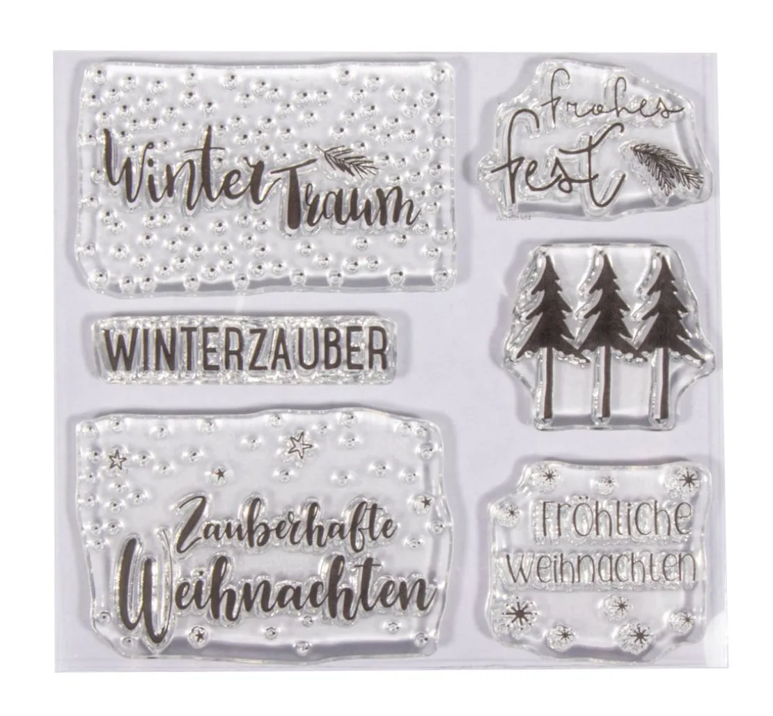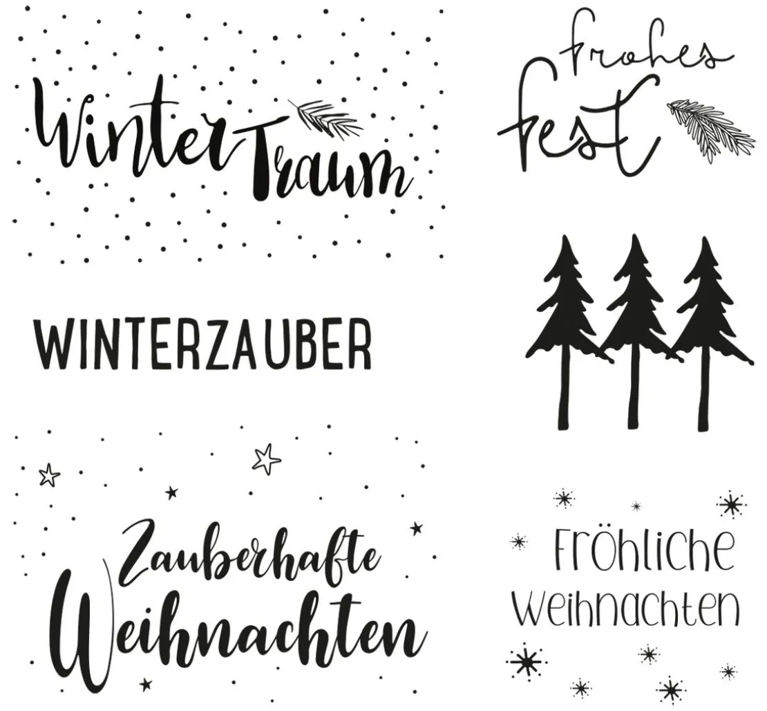 Wunderschöne Clear Stamps „Weihnachtsgrüße“ aus Silikon. Das Stempel-Set besteht aus 6 Stempeln mit einer Motivgröße von ca. 3,3 x 2,8 cm bis 5,8 x 3,8 cm.