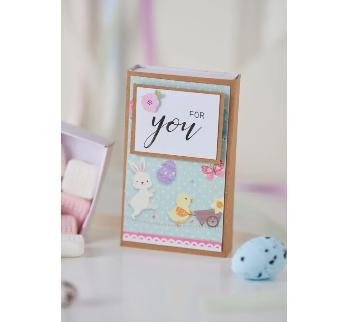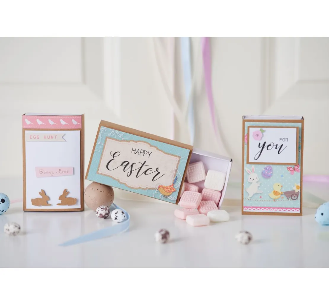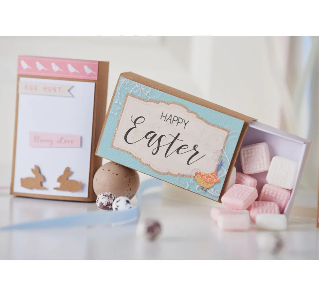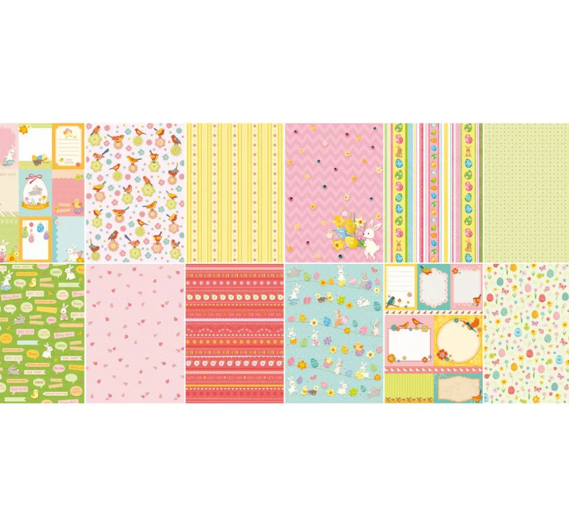 Mit diesem hübschen Motivpapier sind die Karten für das Osterfest und die Geschenkschachteln schnell gebastelt. Das Papier ist sehr dezent mit etwas Glitter veredelt. Die hübschen Frühlingsfarben wie Hellgelb, Hellgrün, Rosa oder Hellblau machen Lust auf den Frühling. Das Papier ist gut mit Streuteilen, Perlen und hübschem Schleifenband kombinierbar.