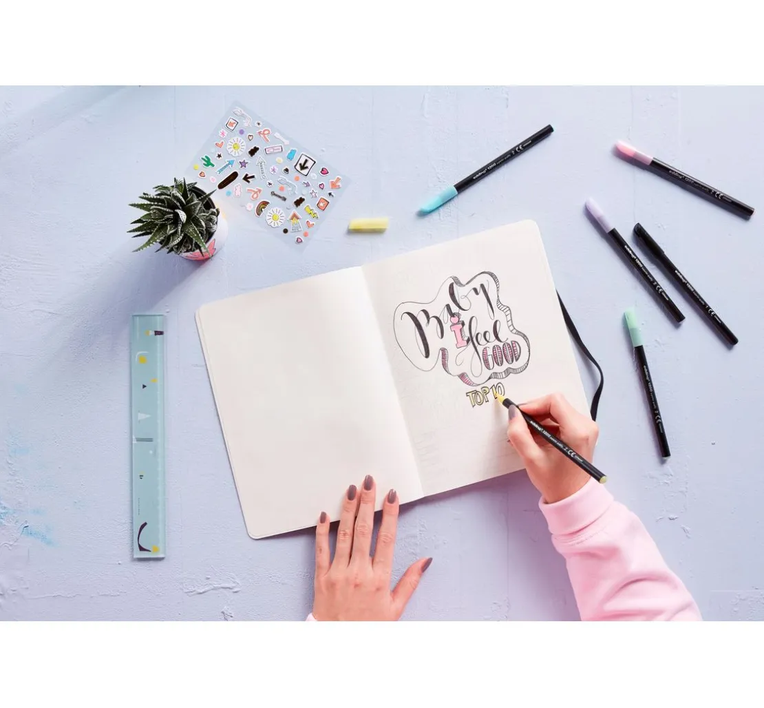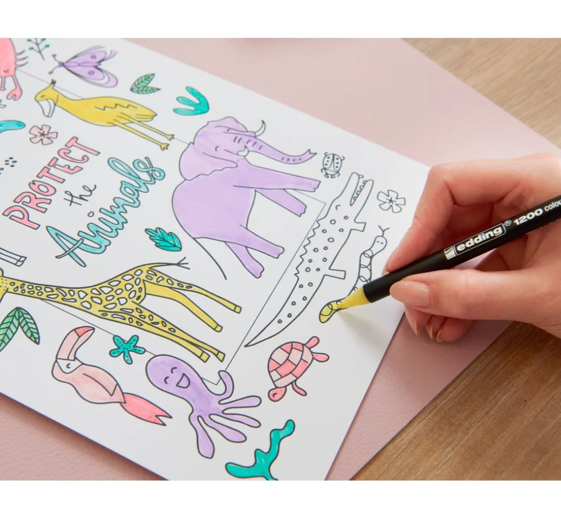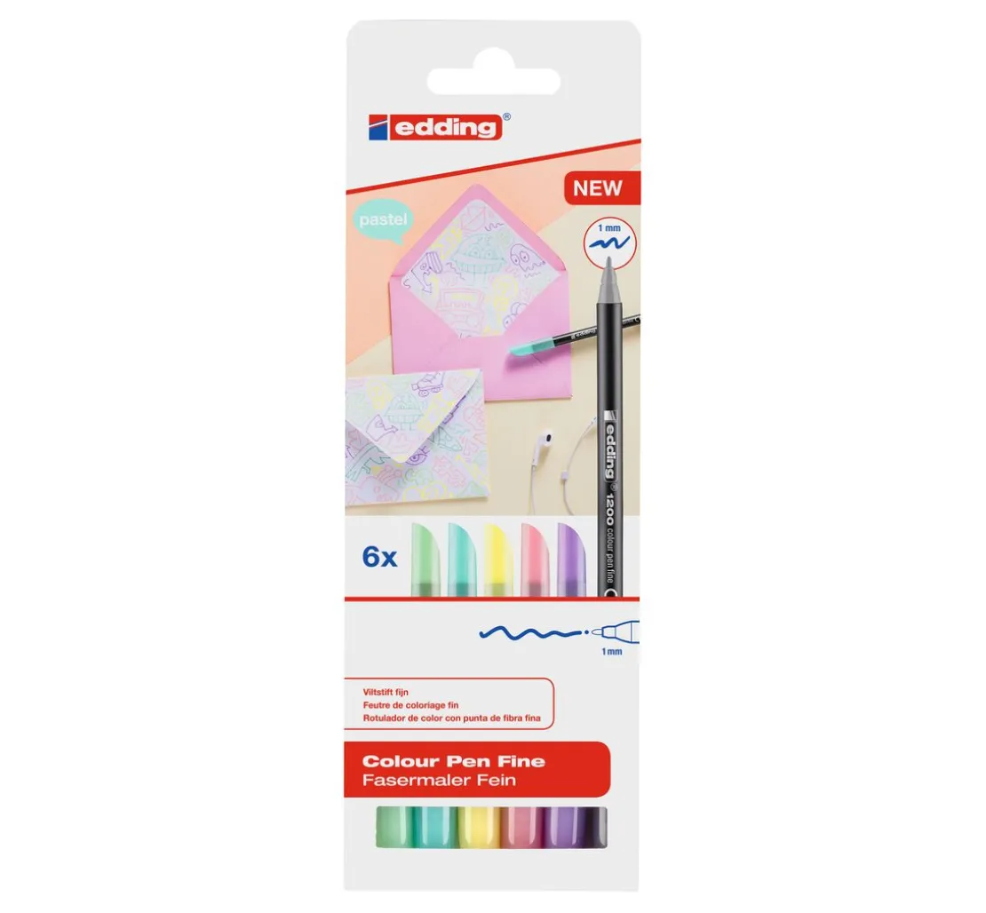 Ein tolles 6er-Set edding Colour Pen Fine Pastell in den Farben Apfelsorbet, Süße Minze, Honigmelone, Kirschblüte, Beerig-Lavendel und Silbergrau. Die Fasermaler verfügen über eine Strichbreite von 1 mm. Die Tinte ist auf Wasserbasis, schlägt nicht durch Papier und lässt sich leicht auf Karton oder Papier auftragen.