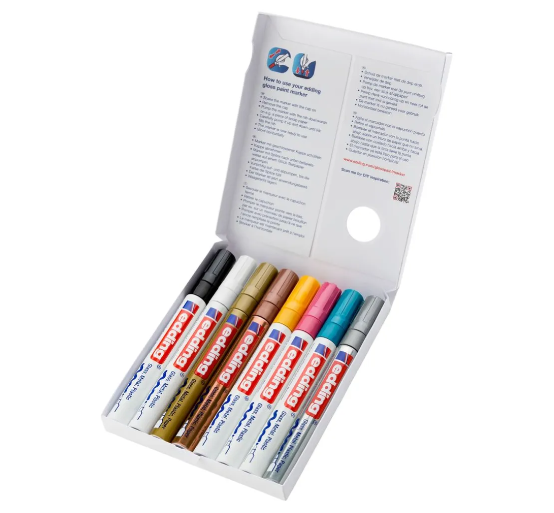Ein Set bestehend aus 8 edding 750 Glanzlack-Marker Metallic/Pastell Stiften. Im Set enthalten sind die Farben Weiß, Gold, Silber, Schwarz, Kupfer, Gelb, Rosa und Hellblau. Das Set erhalten Sie in einer attraktiven Box zum Aufbewahren der Glanzlack-Marker. Ideal auch als Geschenk!