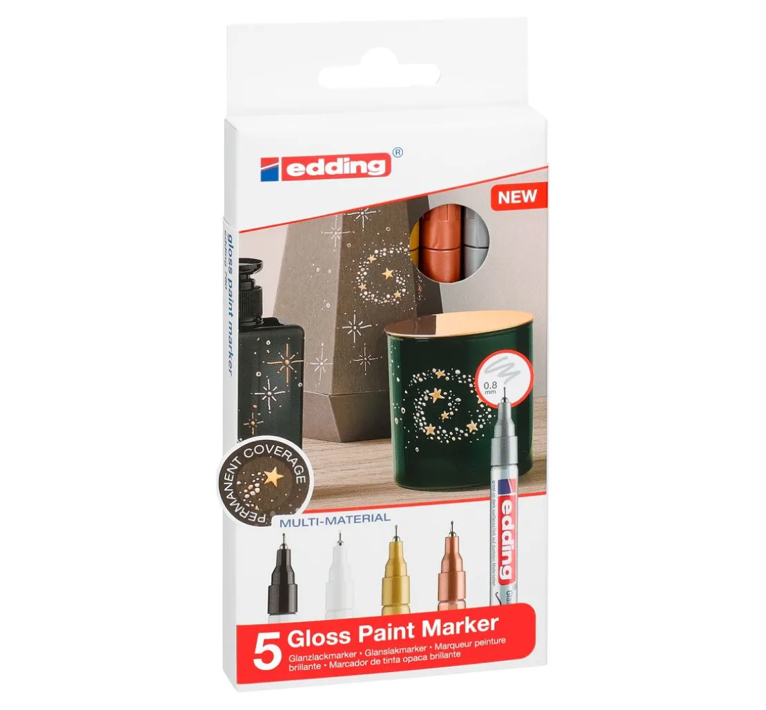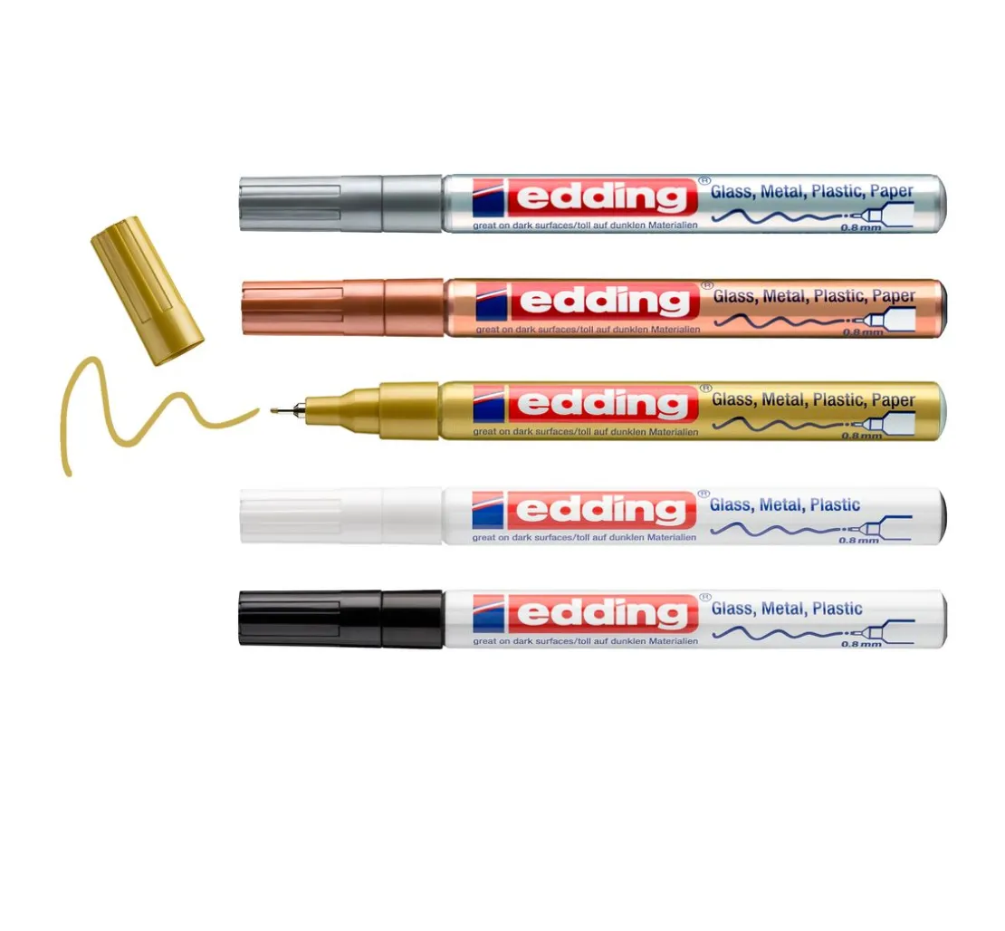 Dieses 5er-Set edding 780 Glanzlack-Marker Metallic Basic enthält die Farben Weiß, Gold, Silber, Schwarz und Kupfer. Die Strichstärke beträgt 0,8 mm. Eine Tinte mit einer permanenten Deckkraft und hoch pigmentiert. Die Stifte sind mit einer Rundspitze ausgestattet die auswechselbar ist. Mit Aktivierungsanleitung auf den Stiften. Das Set erhalten Sie in einer attraktiven Box zum Aufbewahren der Glanzlack-Marker. Eine wunderbare Geschenkidee.