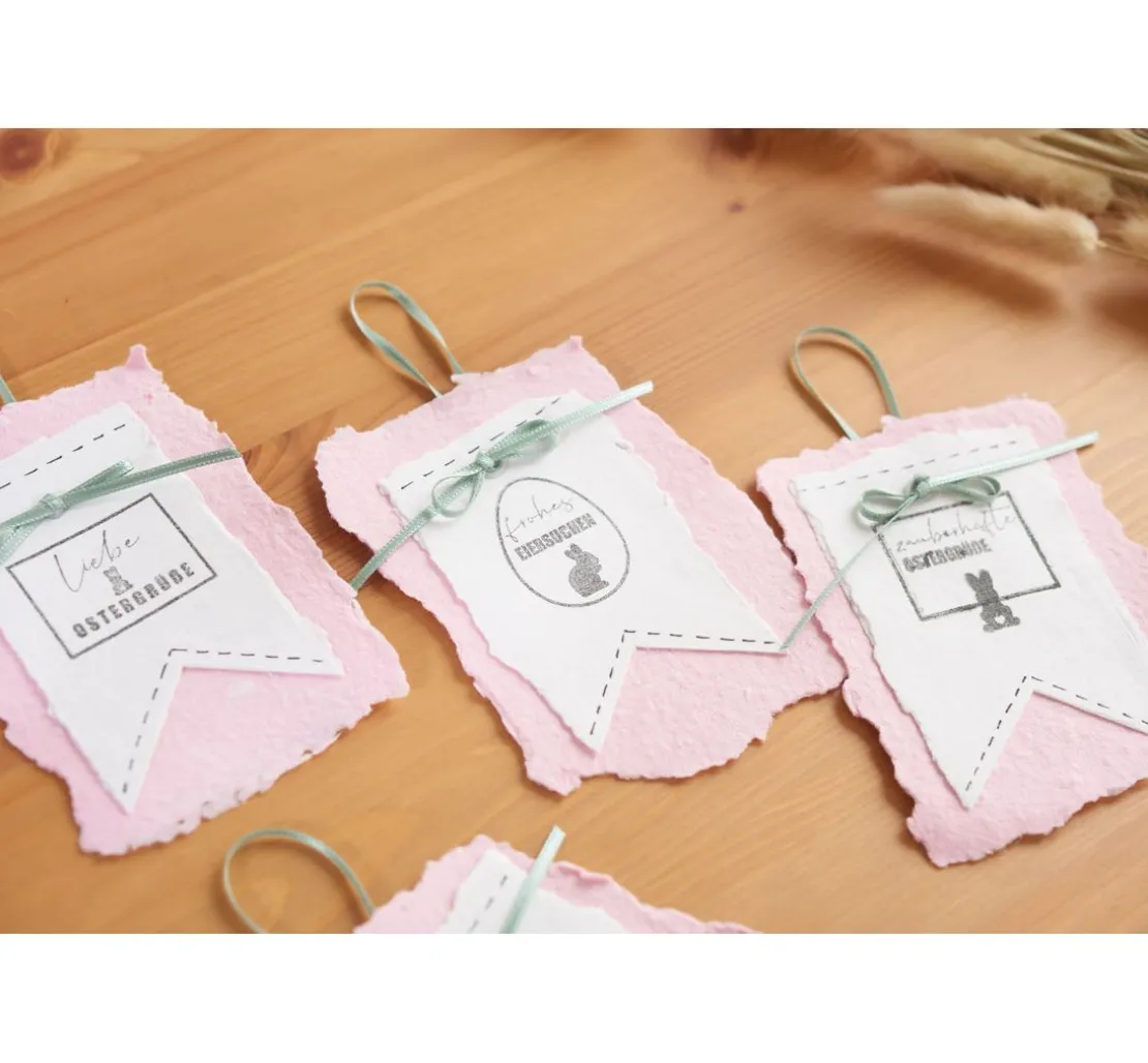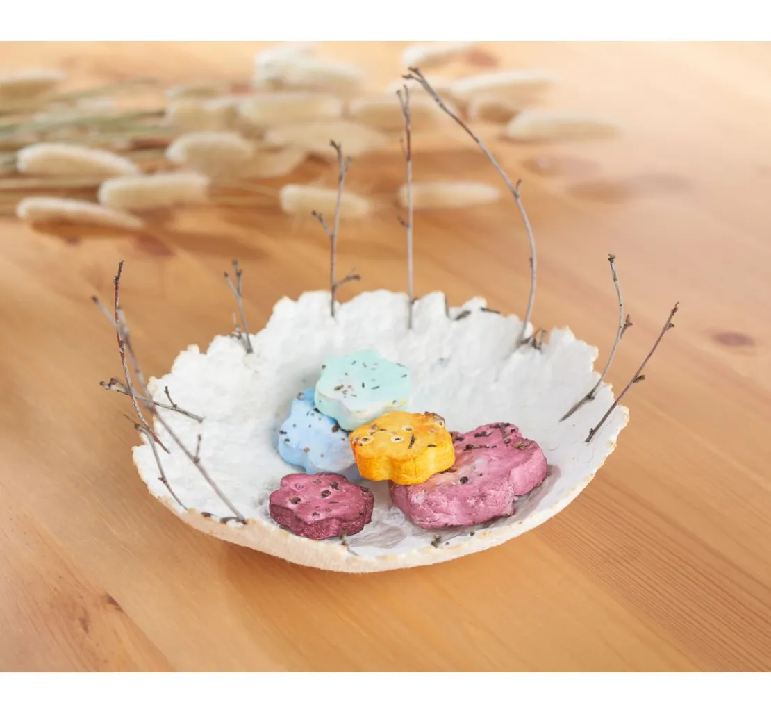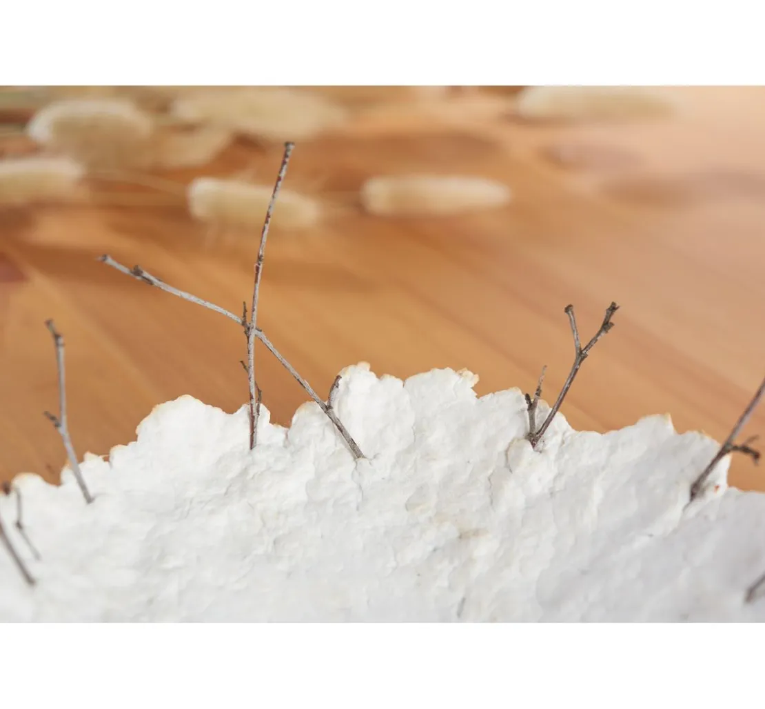 Die weißen langen Eukalyptus-Fasern werden beim Einrühren in den Papierbrei schnell geschmeidig und weich. Ergänzt mit beliebigen weiteren Cellulosefasern entstehen einzigartige und individuell strukturierte Papieroberflächen.
