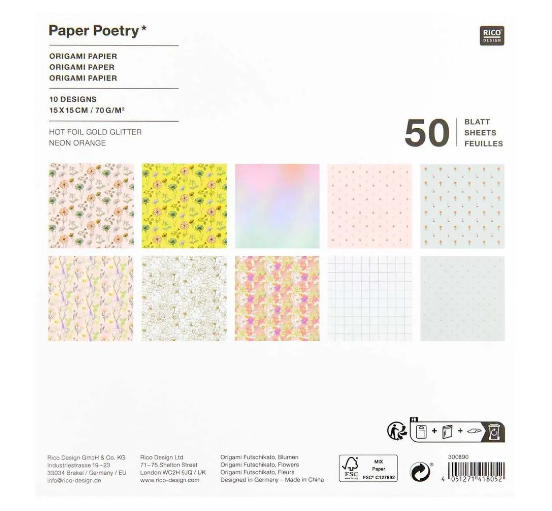 Lass dich von den Faltblättern „Blumen“ inspirieren und deiner Kreativität freien Lauf! Mit diesen Faltblättern kannst du deine eigene Welt der Kreativität erschaffen. Unsere Faltblätter sind aus hochwertigem Papier gefertigt und zeigen verschiedene Blumenmotive in Neon Orange oder mit einer hochwertigen Hotfoil Veredelung in Gold. Sie sind 15 cm breit, 15 cm lang und 70 g/m² schwer und enthalten 50 Blatt. Dank der FSC Zertifizierung ist das Papier umweltfreundlich und nachhaltig.