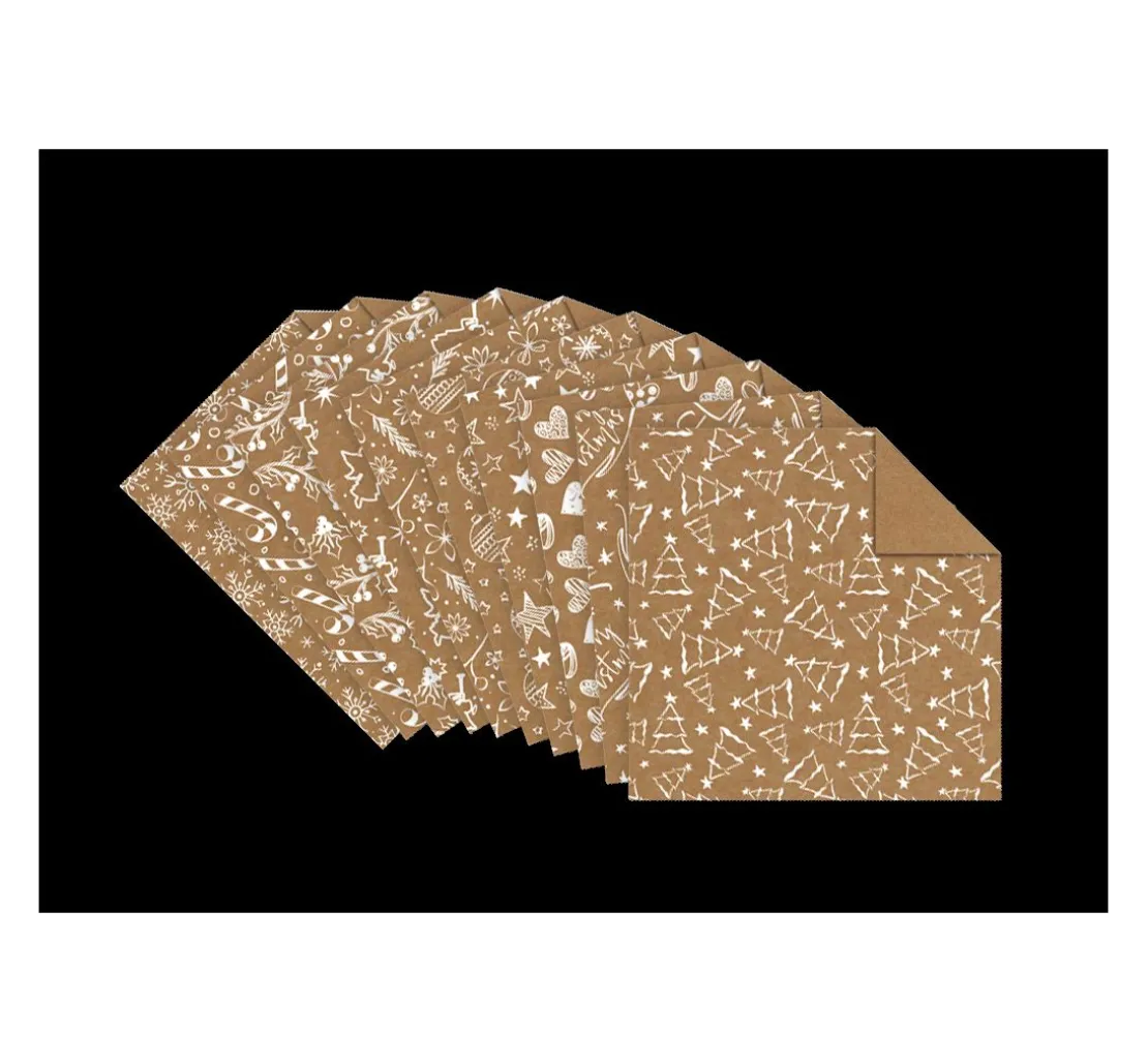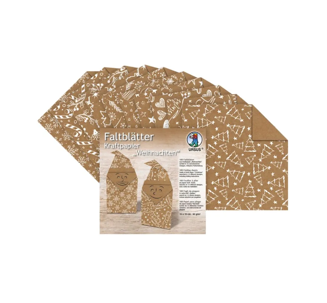 Wunderschöne ca. 15 x 15 cm große Faltblätter „Kraftpapier Weihnachten“ mit 100 Blättern in 10 verschiedenen Designs. Die Blätter haben ein Papiergewicht von 80 g/m². Das Muster ist einseitig mit Weiß bedruckt und bildet einen guten Kontrast zu dem braunen Untergrund.