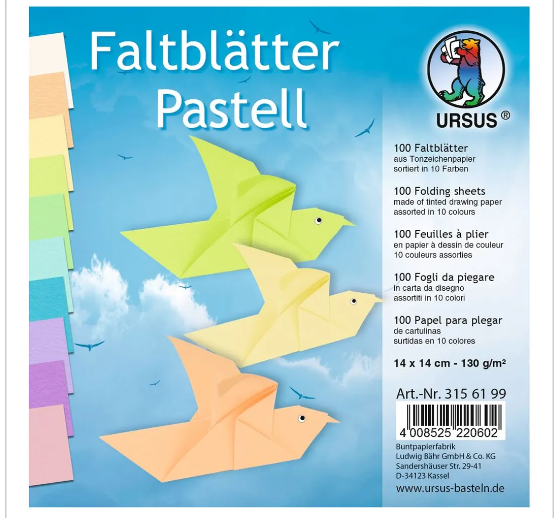 Diese wunderschönen Faltblätter „Pastell“ sollten in keiner Bastelkiste fehlen. Die 100 bunten Faltblätter haben eine Größe von ca. 14 x 14 cm mit einem Papiergewicht von ca. 130 g/m². Jede der 10 Farben ist 10-mal enthalten.