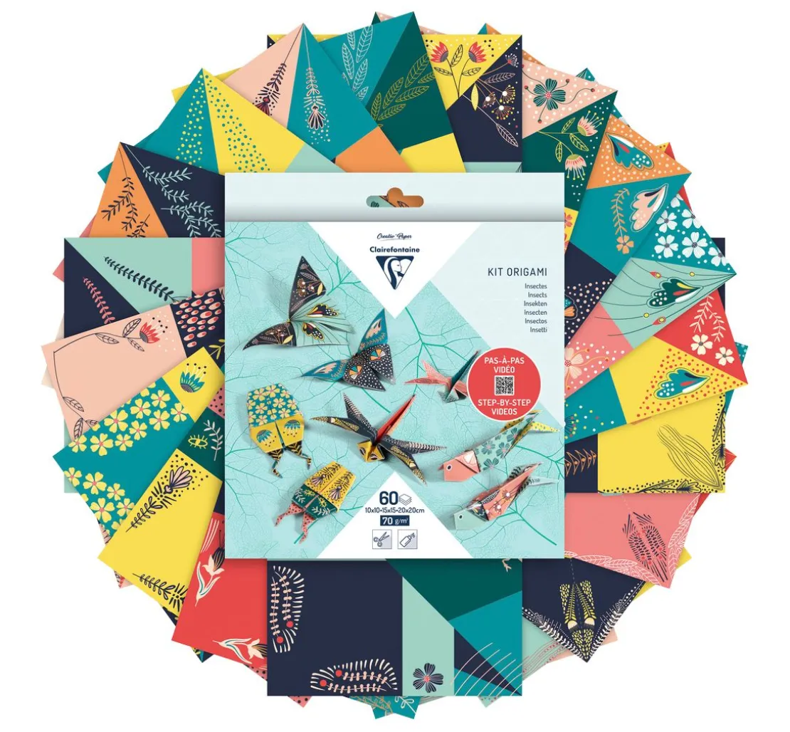 Das Faltpapier-Sortiment „Insekten“ enthält 60 Faltblätter, die sich Schritt für Schritt in Insekten verwandeln. Die Papiere haben eine Größe von ca. 10 x 10 cm, 15 x 15 cm und 20 x 20 cm mit einer Grammatur von ca. 70 g/m².