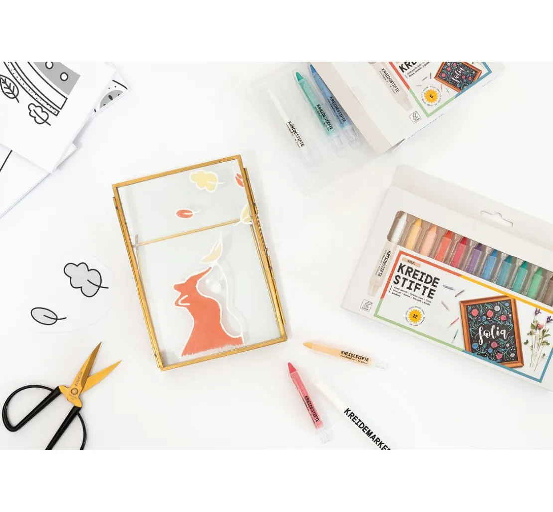 Gestalten Sie Fensterscheiben, Glasscheiben, Vasen oder auch Deko- oder Vorratsgläser mit diesen Motiven. Der Vorteil von Kreidemarkern ist – die Malerei lässt sich ganz einfach mit einem feuchten Tuch wieder ablösen. So können Sie immer wieder neue Dekorationen auftragen – passend zur Jahreszeit.