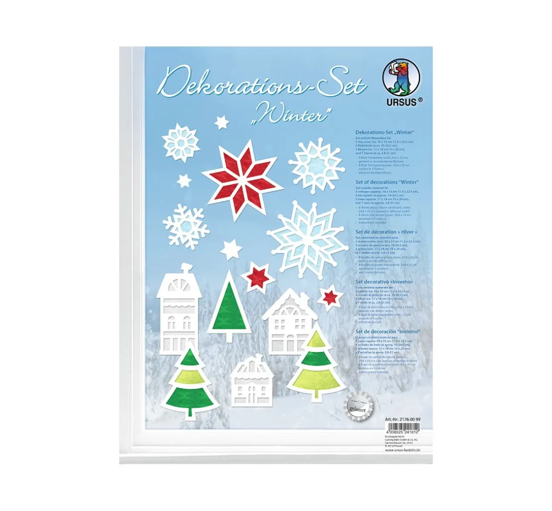 Dieses Bastel-Set enthält genügend Material, um daraus 3 Häuschen ca. 10,0 x 13,0 cm bis 11,5 x 22,5 cm, 4 Eiskristalle ca. 10,0 cm bis 20,5 cm, 3 Tannenbäume ca. 11,0 x 18,0 cm bis 15,0 x 20,0 cm und 7 Sterne ca. 3,8 bis 21,0 cm zu gestalten, sowie eine ausführliche Bastelanleitung. Die fertigen Fensterbilder lassen sich hervorragend an Fenster oder Türen hängen. Auch zum Verzieren von Geschenken als Anhänger eigens sich die Fensterbilder super.