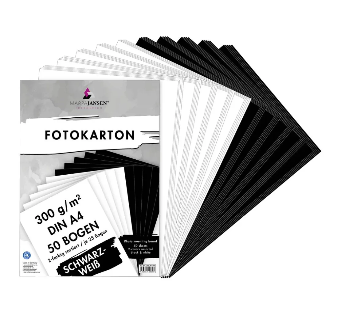 Du suchst nach einer hochwertigen Fotokarton-Sortierung, die dir einzigartige Bastelmöglichkeiten bietet? Dann ist diese Fotokarton-Sortierung „Schwarz-Weiß“ genau das Richtige für dich! Der Fotokarton ist DIN A4, 50 Bogen, 2-farbig sortiert, 300 g/m², matt, glatt, chlor- und säurefrei. Je 25 Bogen in Schwarz und Weiß. Er ist umweltschonend und nachhaltig produziert und durch die Herstellung in Deutschland können eine perfekte Qualität und strengste Umweltkontrollen garantiert werden.