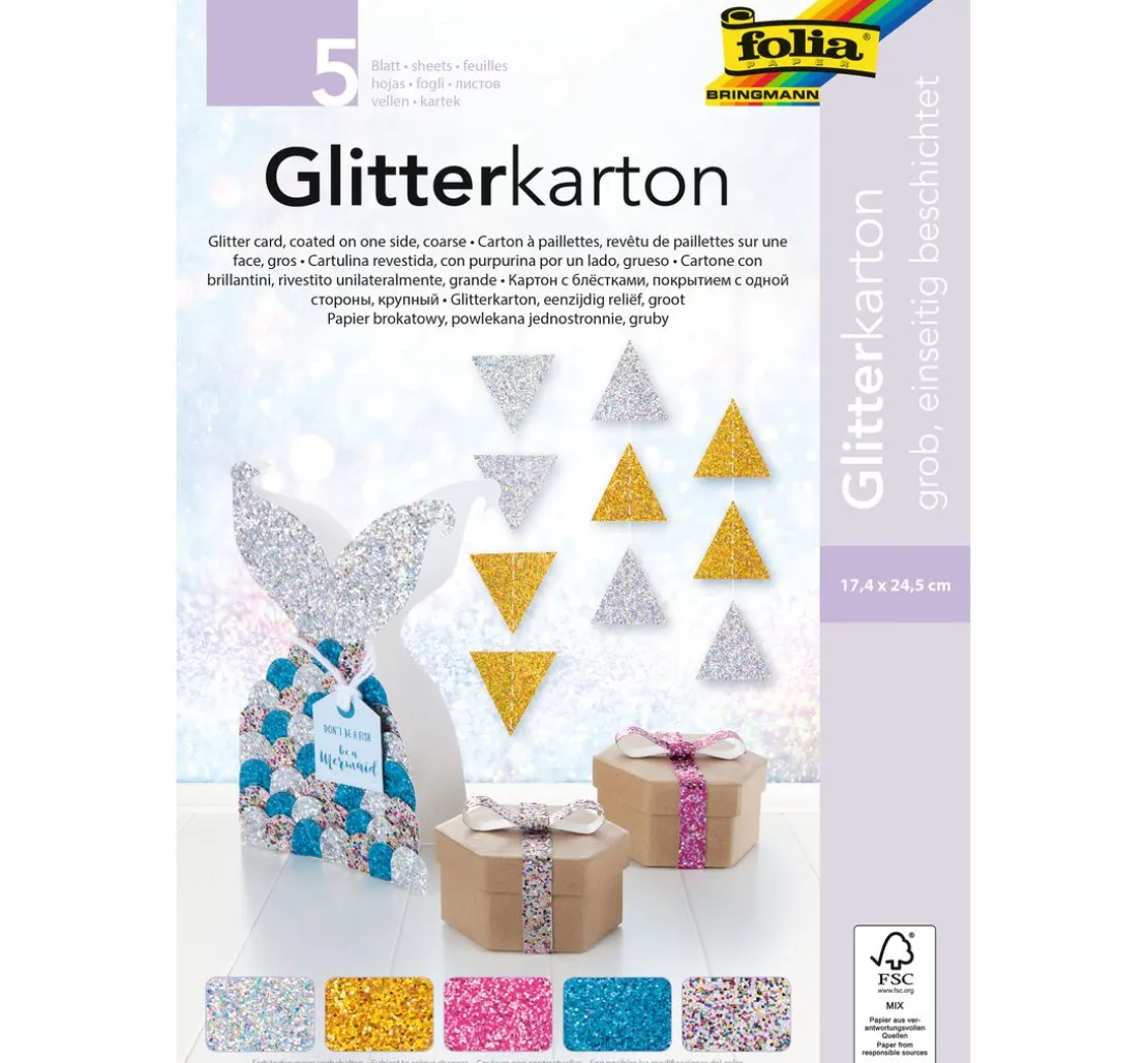 Wunderschöner Glitterkarton „Konfetti“ mit einer Größe von ca. 17,4 x 24,5 cm. Die 5 funkelnden Bogen in den Farben Silber, Gold, Pink, Blau und Multi sind einseitig mit Glitter beschichtet.