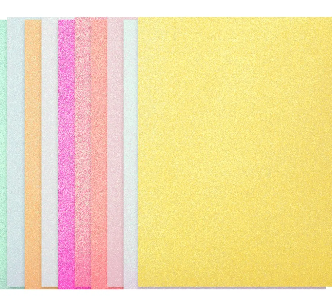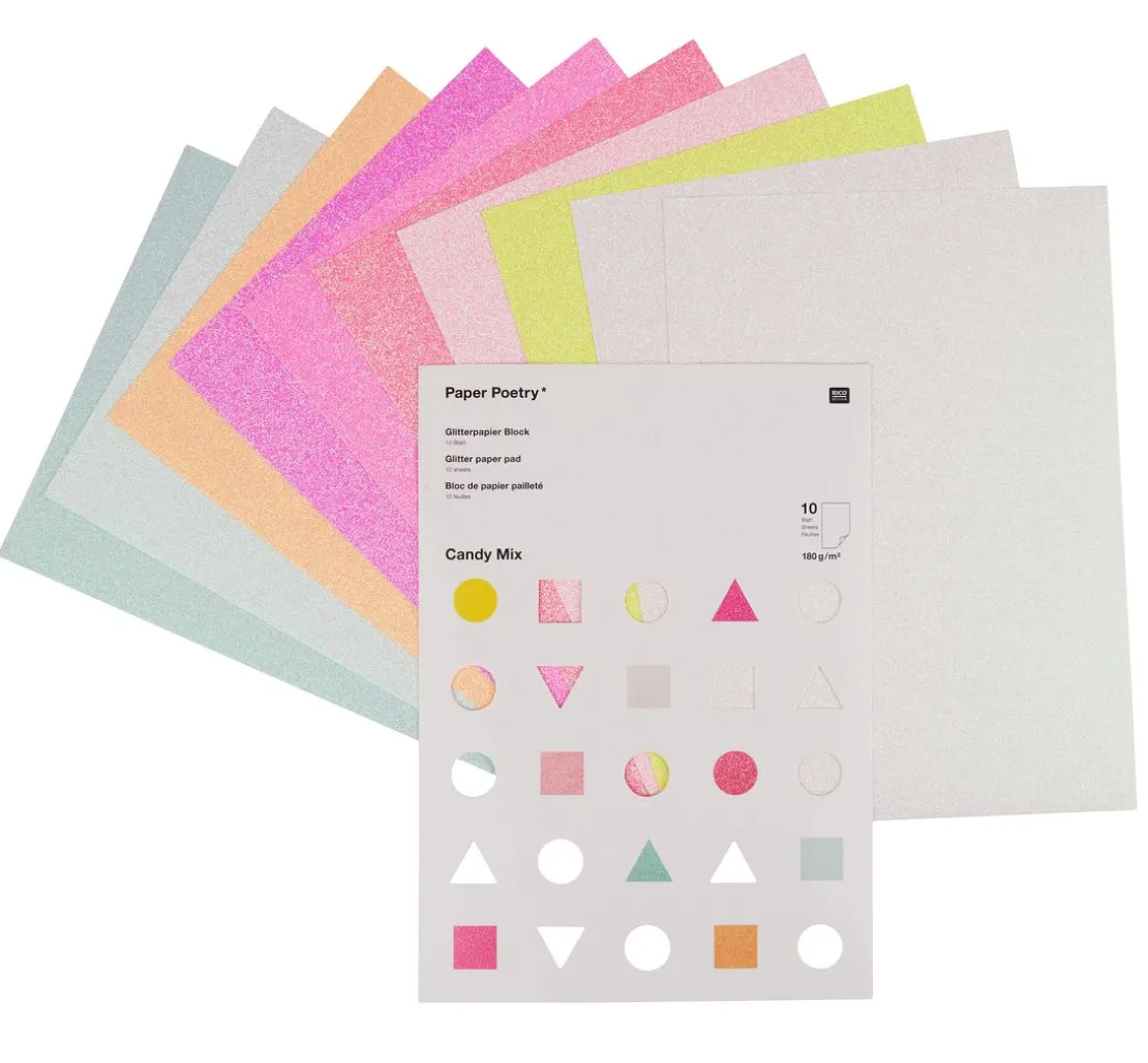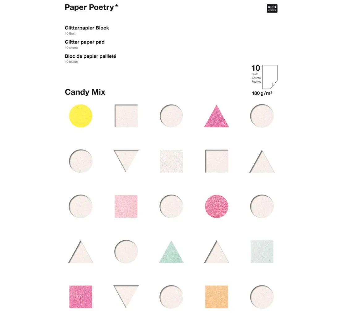 Der „Candy Mix“ Glitterpapier Block ist ein hochwertiger Block Format DIN A4. In dem Block sind 10 Blätter enthalten, die eine Grammatur von 180 g/m2 haben. Die Rückseiten sind Weiß.