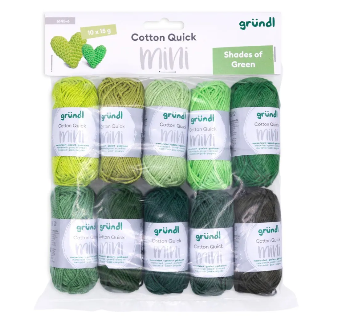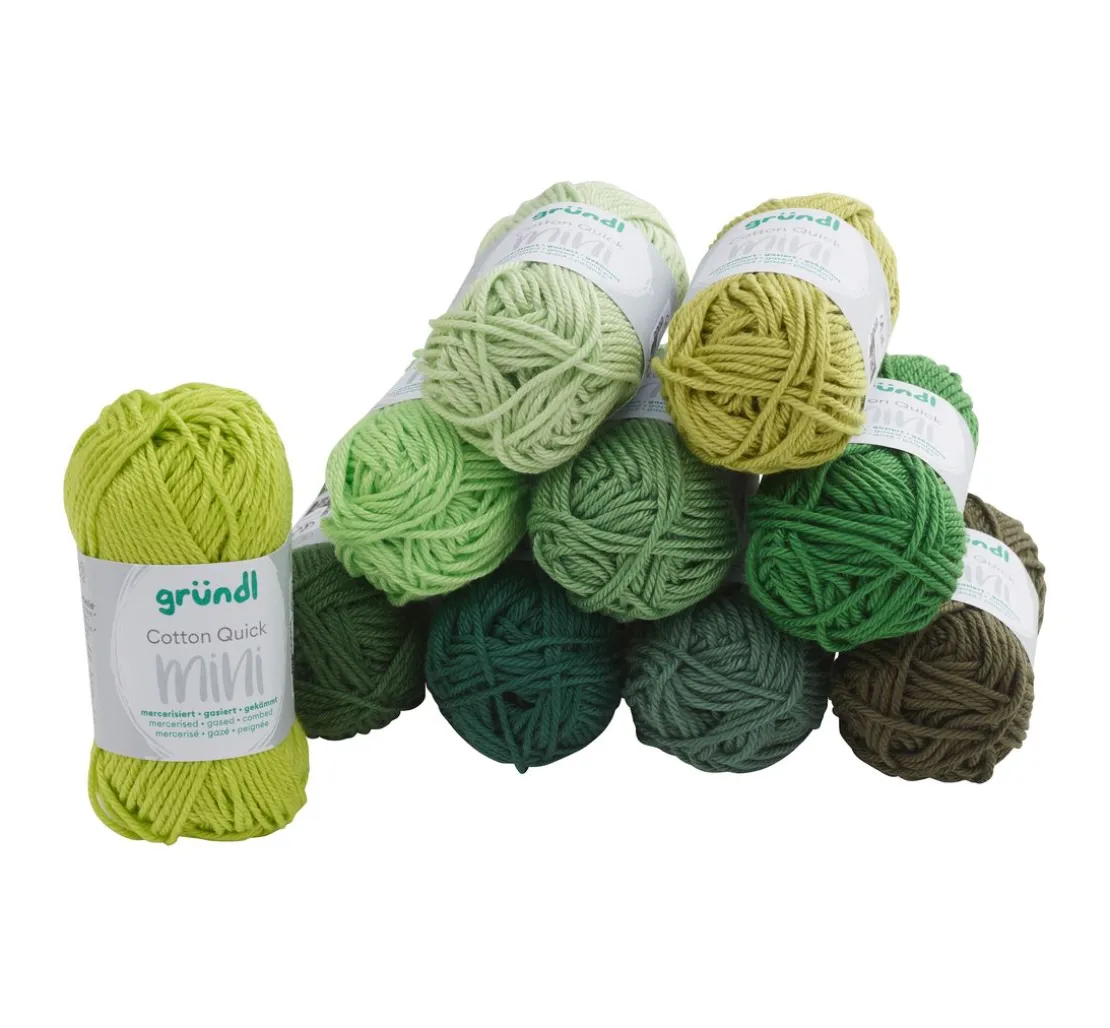 Die Gründl Cotton Quick Mini „Shades of Green“ sind eine harmonische Zusammenstellung aus 10 Häkelgarnen in den verschiedensten Grüntönen. Jedes Knäuel hat eine Lauflänge von ca. 37,5 m und ein Gewicht von ca. 15 g. Hergestellt aus 100 % Baumwolle, mercerisiert, gasiert und gekämmt. Mit einer Nadelstärke von 3 – 4 lässt sich das Garn am besten verarbeiten.