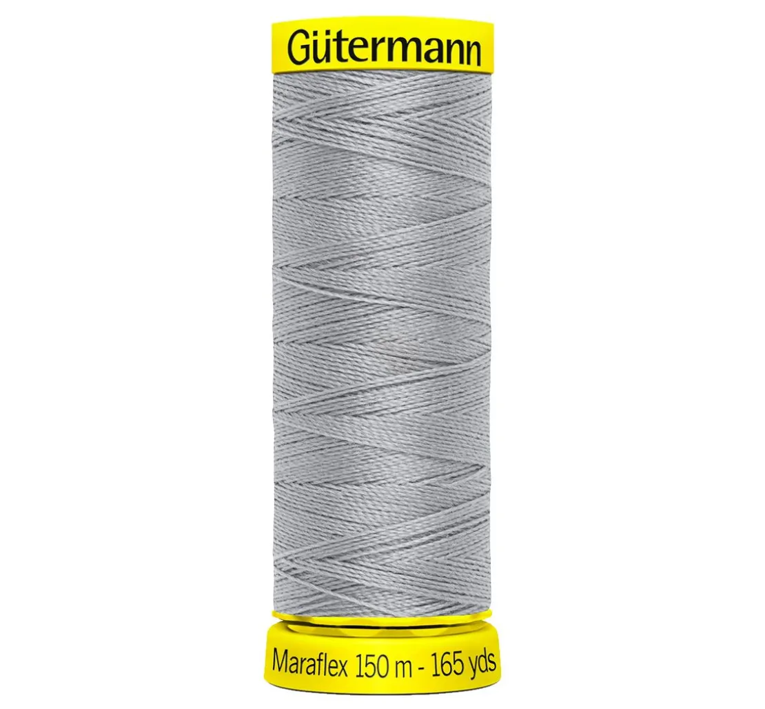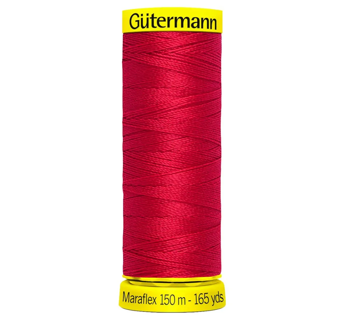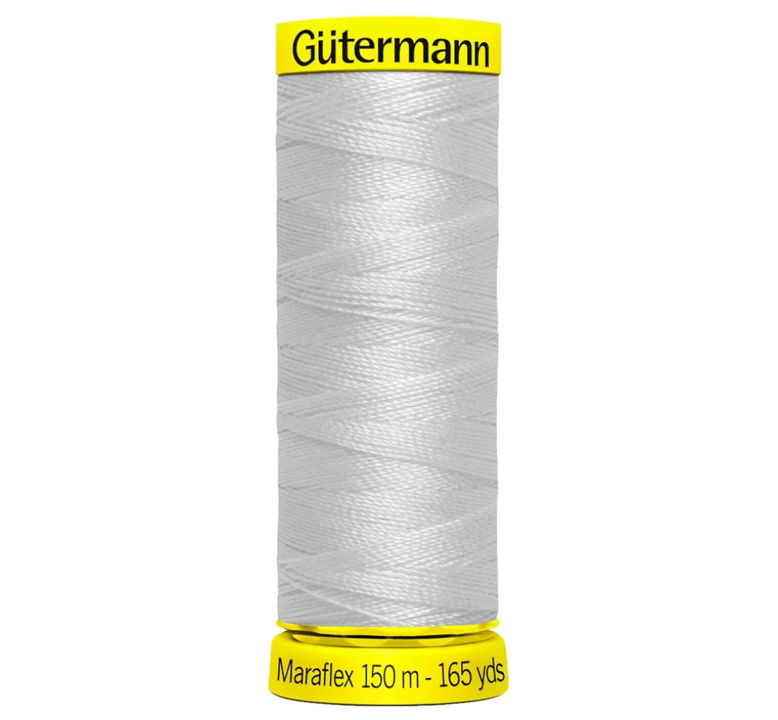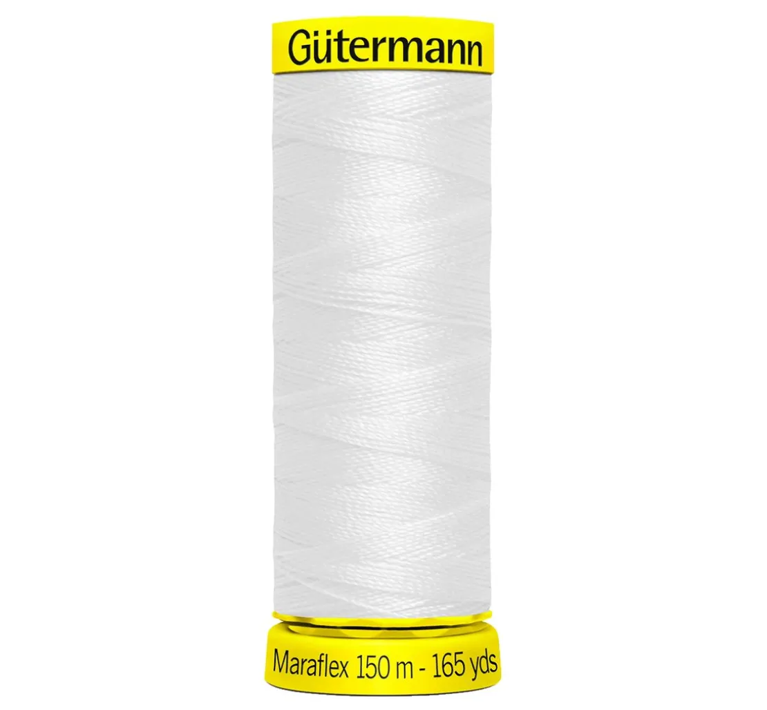 Gütermann Maraflex, No. 120 für hochelastische Nähte mit einer Länge von ca. 150 m in einer großen Farbauswahl. Dieses Garn ist geeignet für Nadelstärke NM 70-80 / 10–12. Das Material ist aus 100 % Polybutylenterephthalat und waschbar bei 60 °C.