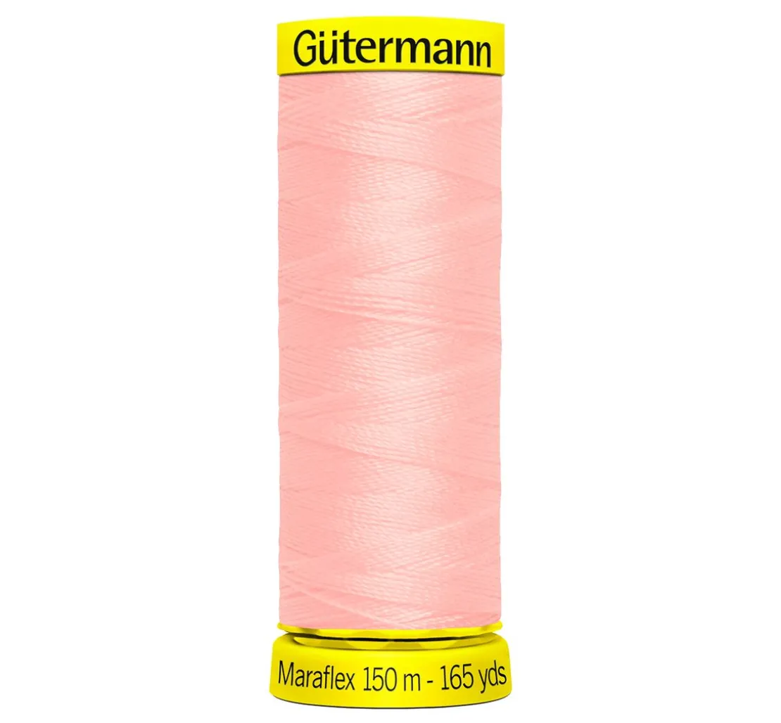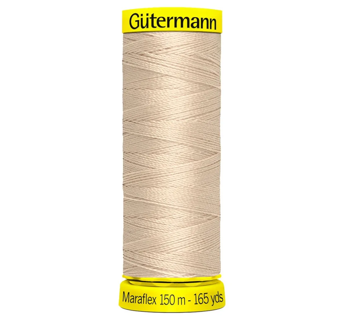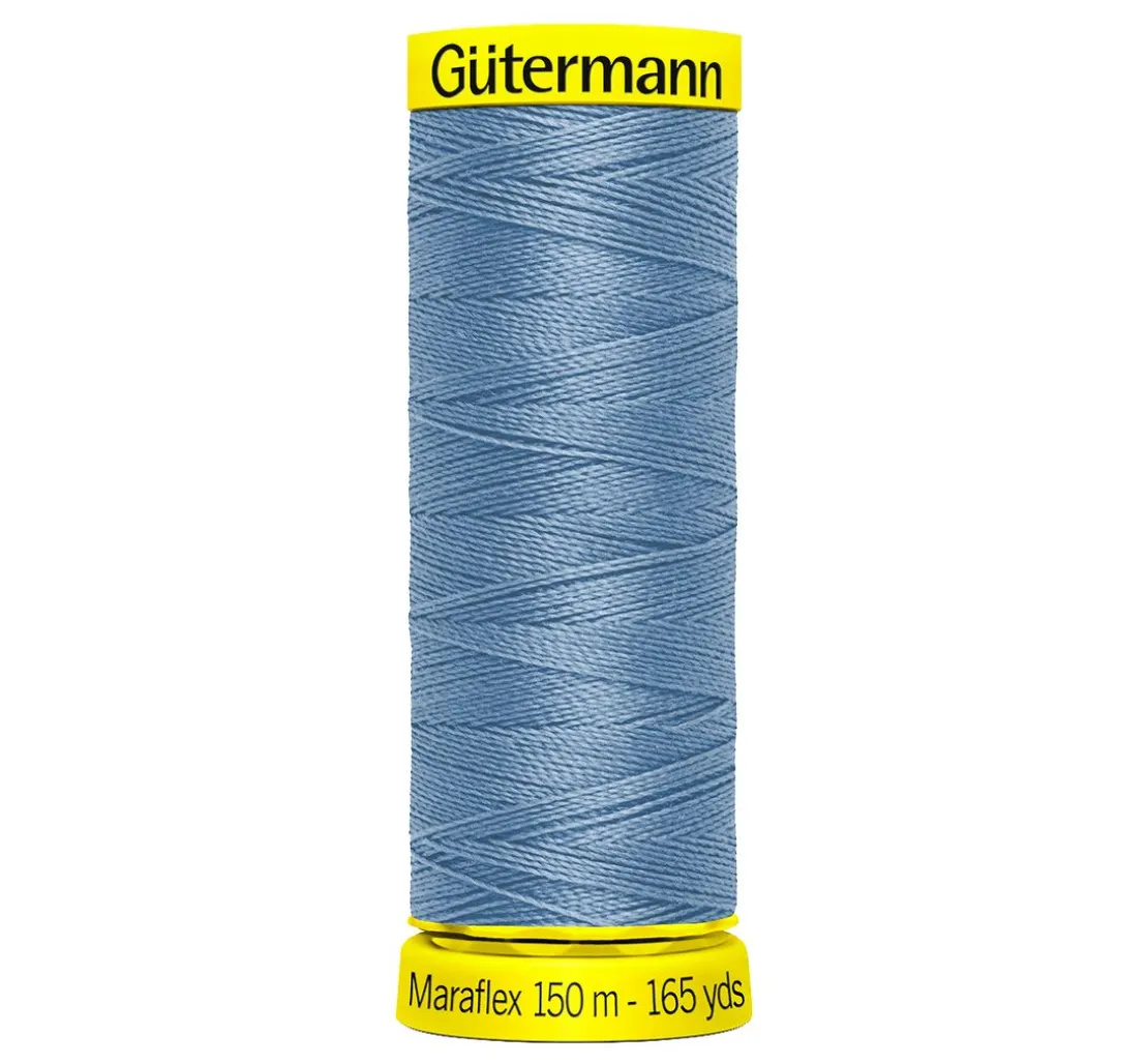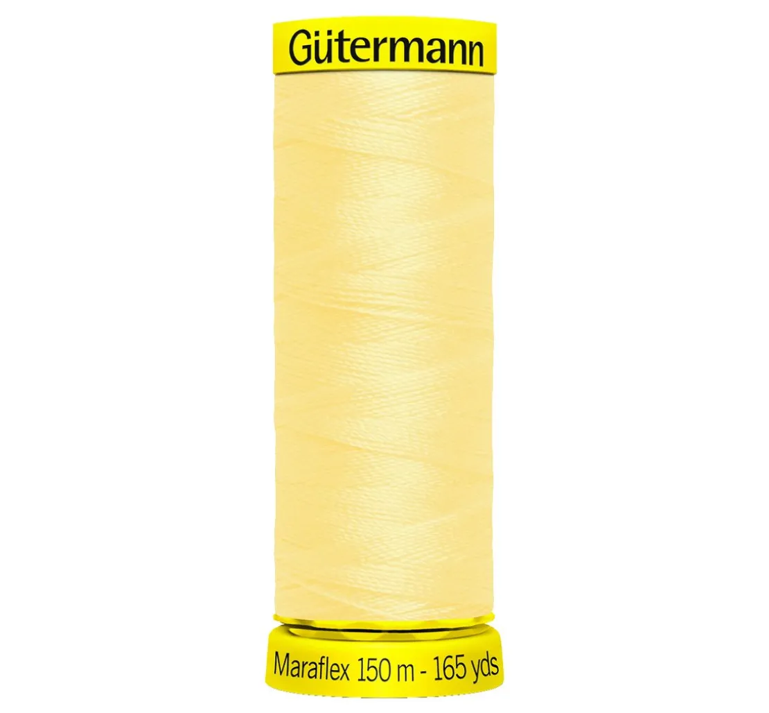 Gütermann Maraflex, No. 120 für hochelastische Nähte mit einer Länge von ca. 150 m in einer großen Farbauswahl. Dieses Garn ist geeignet für Nadelstärke NM 70-80 / 10–12. Das Material ist aus 100 % Polybutylenterephthalat und waschbar bei 60 °C.