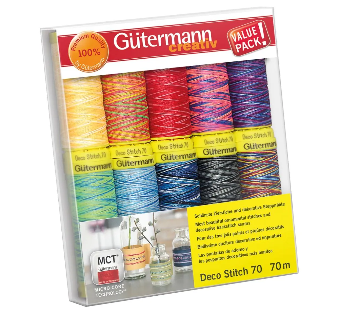 Gütermann Nähfaden Deco-Stitch 70, Col. 3, Multicolor als Set enthält 10 Spulen à 70 m in verschiedenen Multicolor-Farben, die perfekt auf die Stichdichte von Zierstichen auf Haushaltsnähmaschinen abgestimmt sind. So kannst du wunderschöne Zierstiche und dekorative Steppnähte zaubern, die deine Nähprojekte zu echten Hinguckern machen.