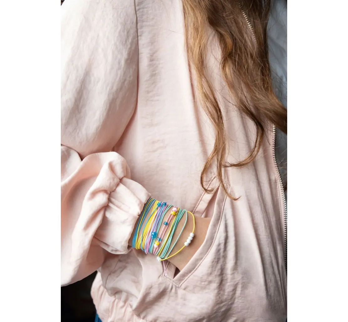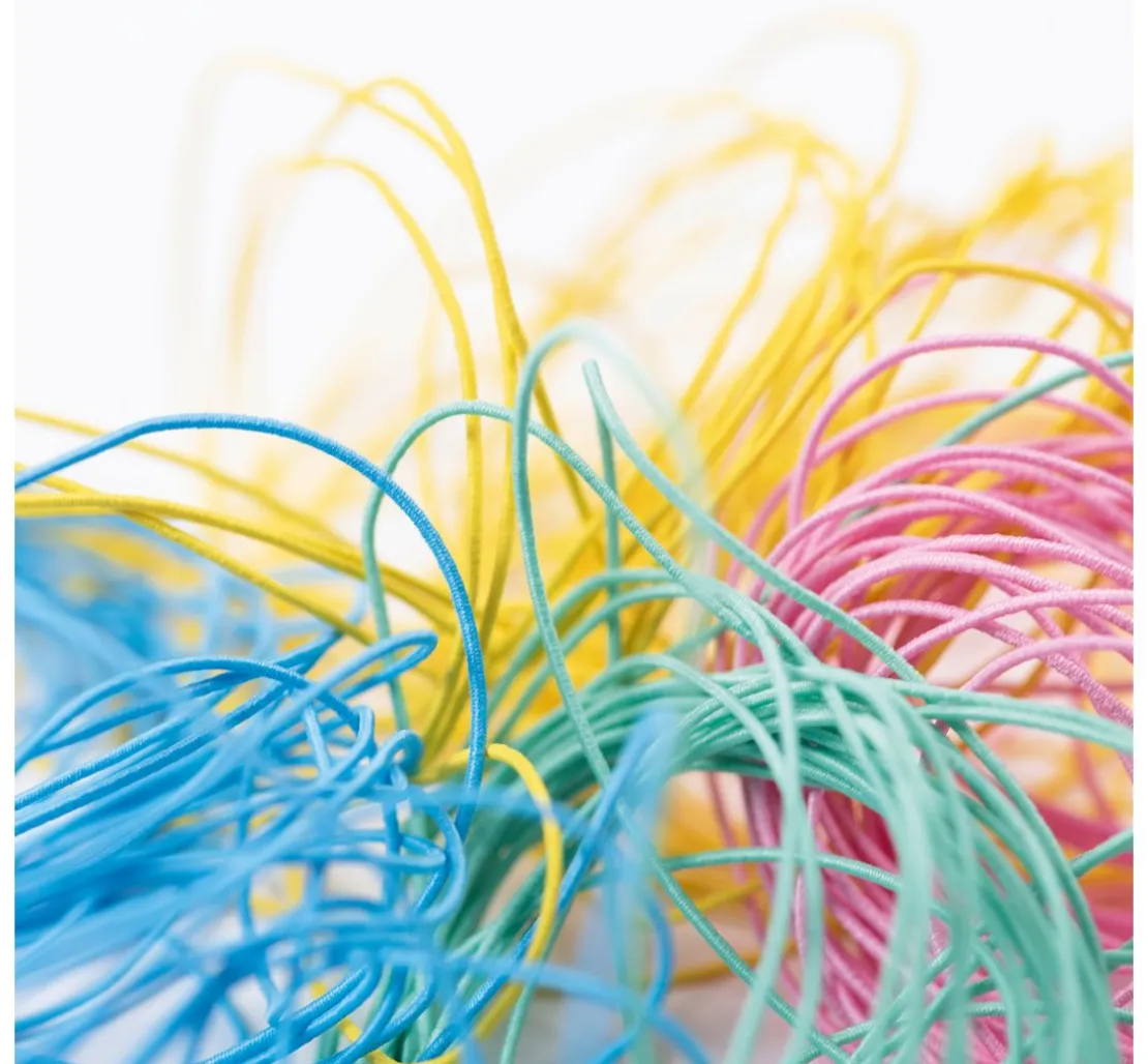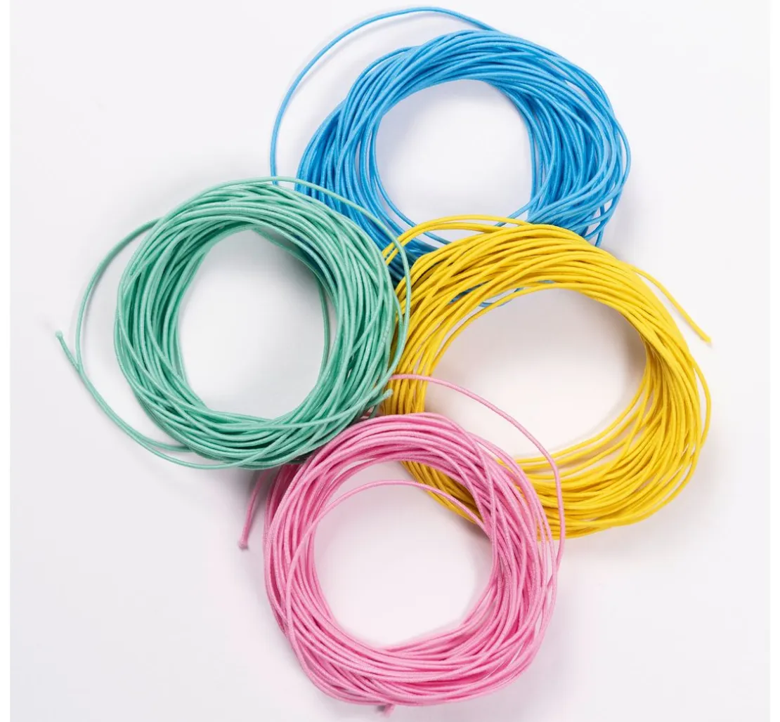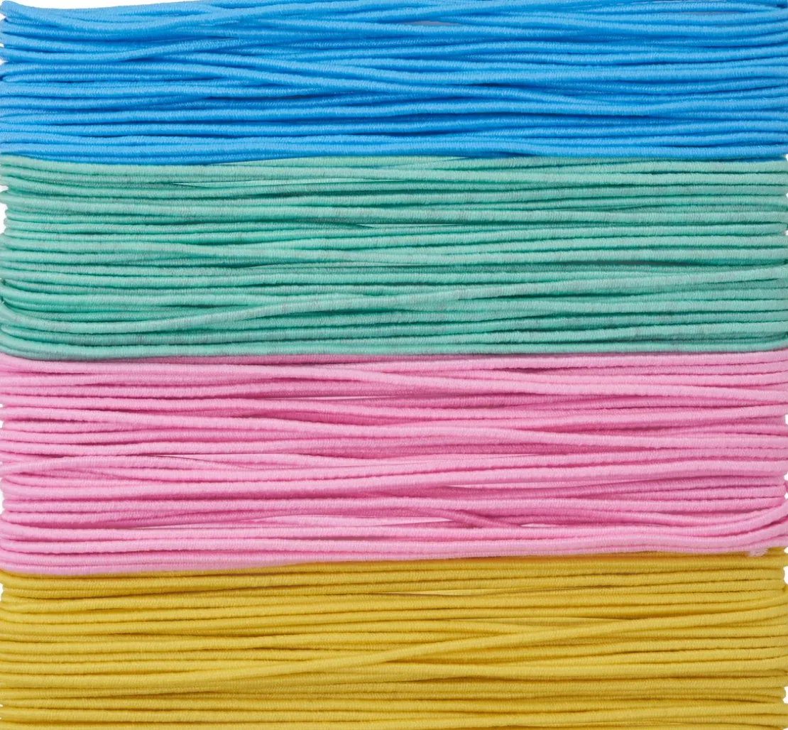 Tolle Gummischnüre „Pastell“ im 4er-Set. Die Schnüre in Blau, Mint, Rosa und Gelb haben je eine Länge von ca. 5 m.